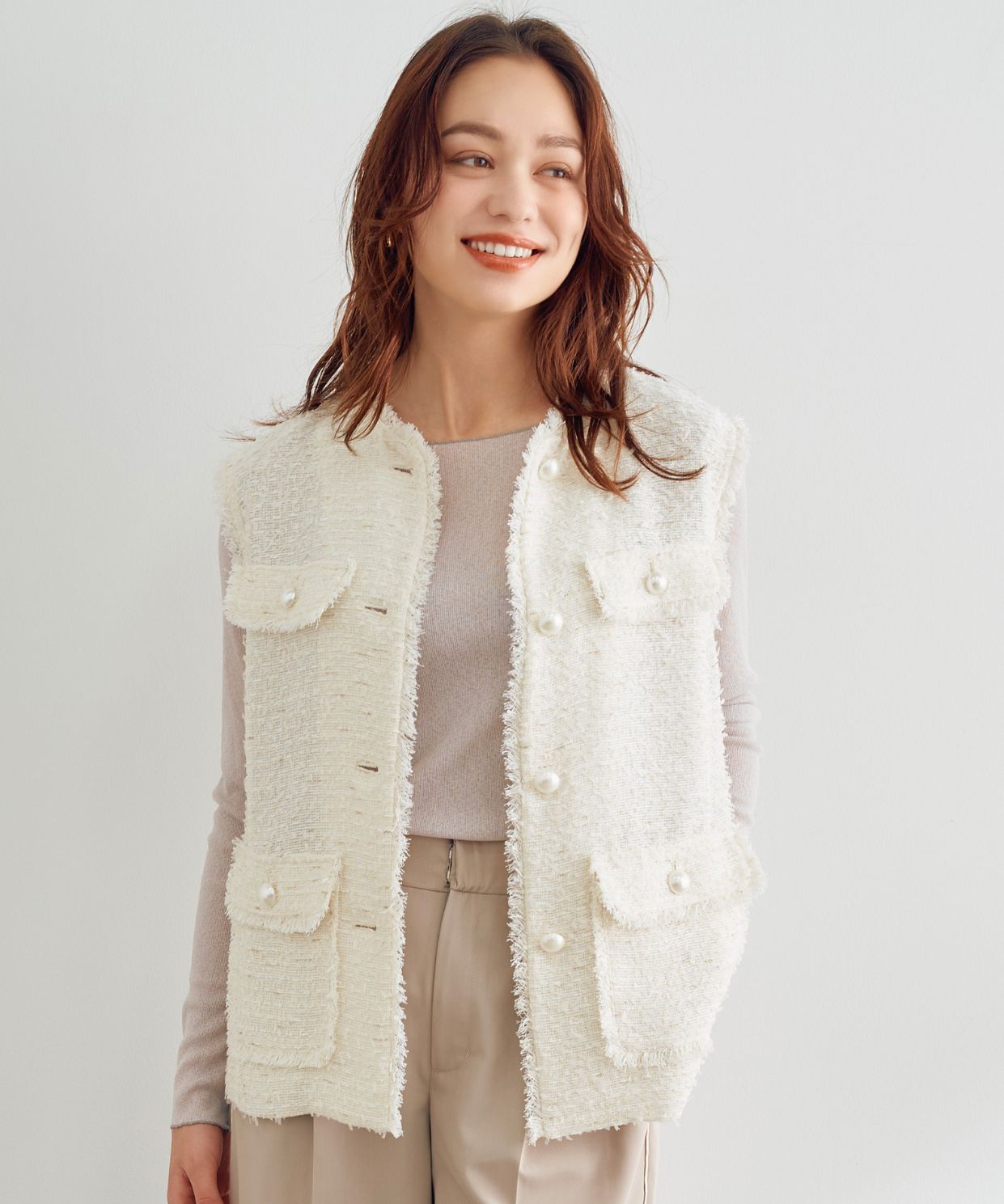 【着用感】:裏地もなく軽いので暑い時期から着れるツイードアイテム
