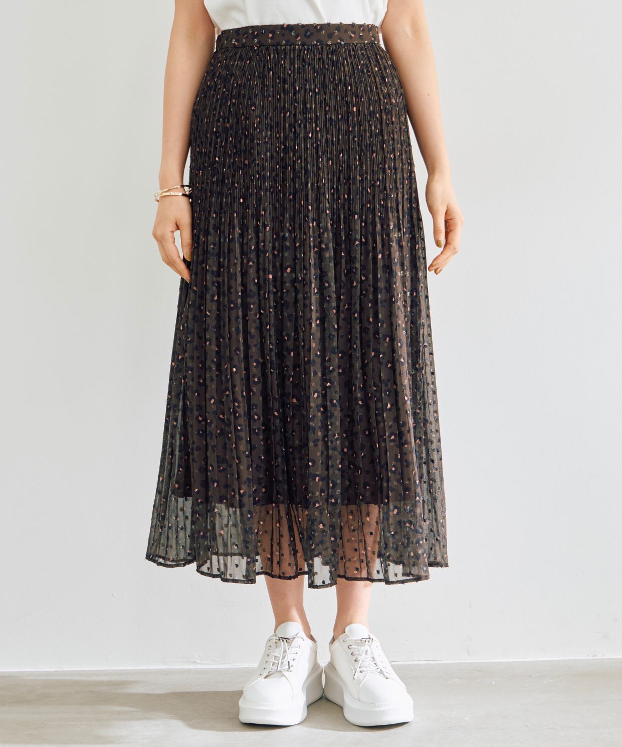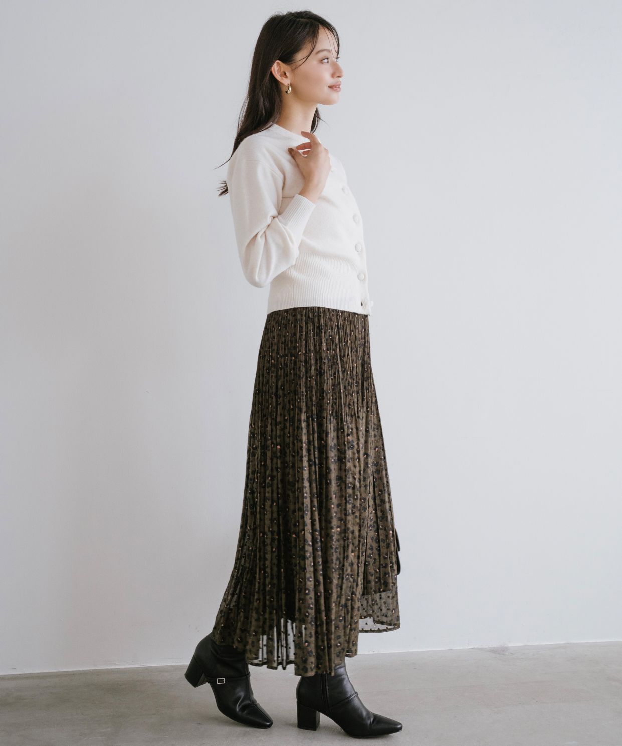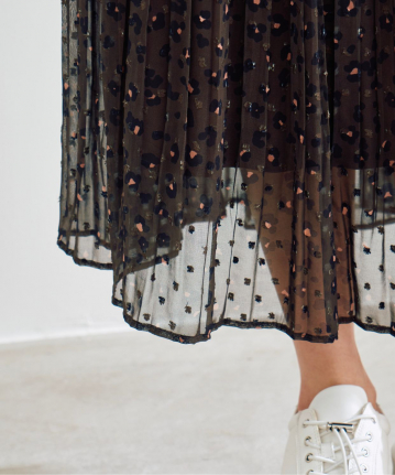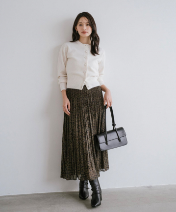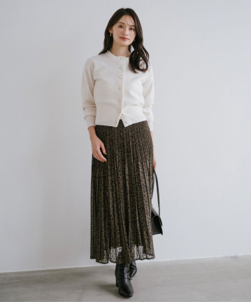 【着用感】:丈は長めですが、シアー感あるので、小柄でも合わせやすく、プリーツは広がらずにスッキリ穿ける