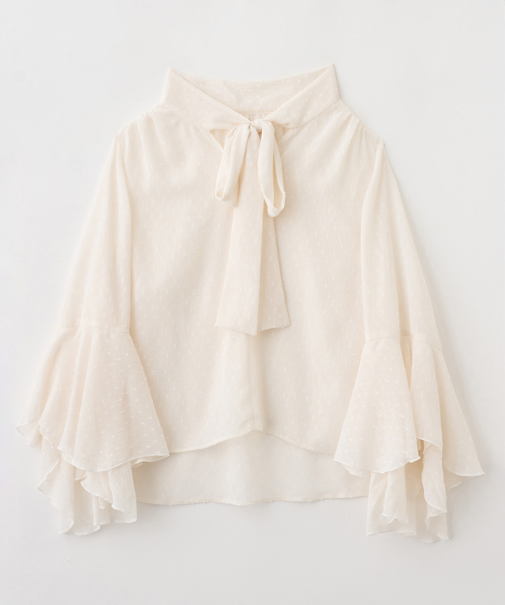 【着用感】: 生地は柔らかく、さらっとしている。シアー感のある素材なので、上からジャケットを羽織っても袖のフリルがもたつかずにスルッと袖を通せます!