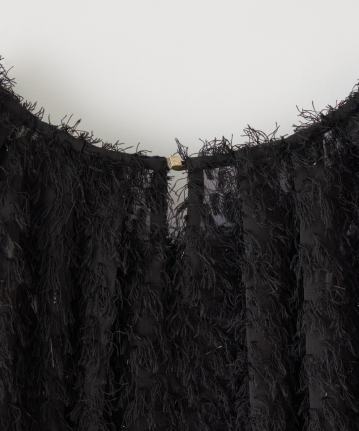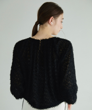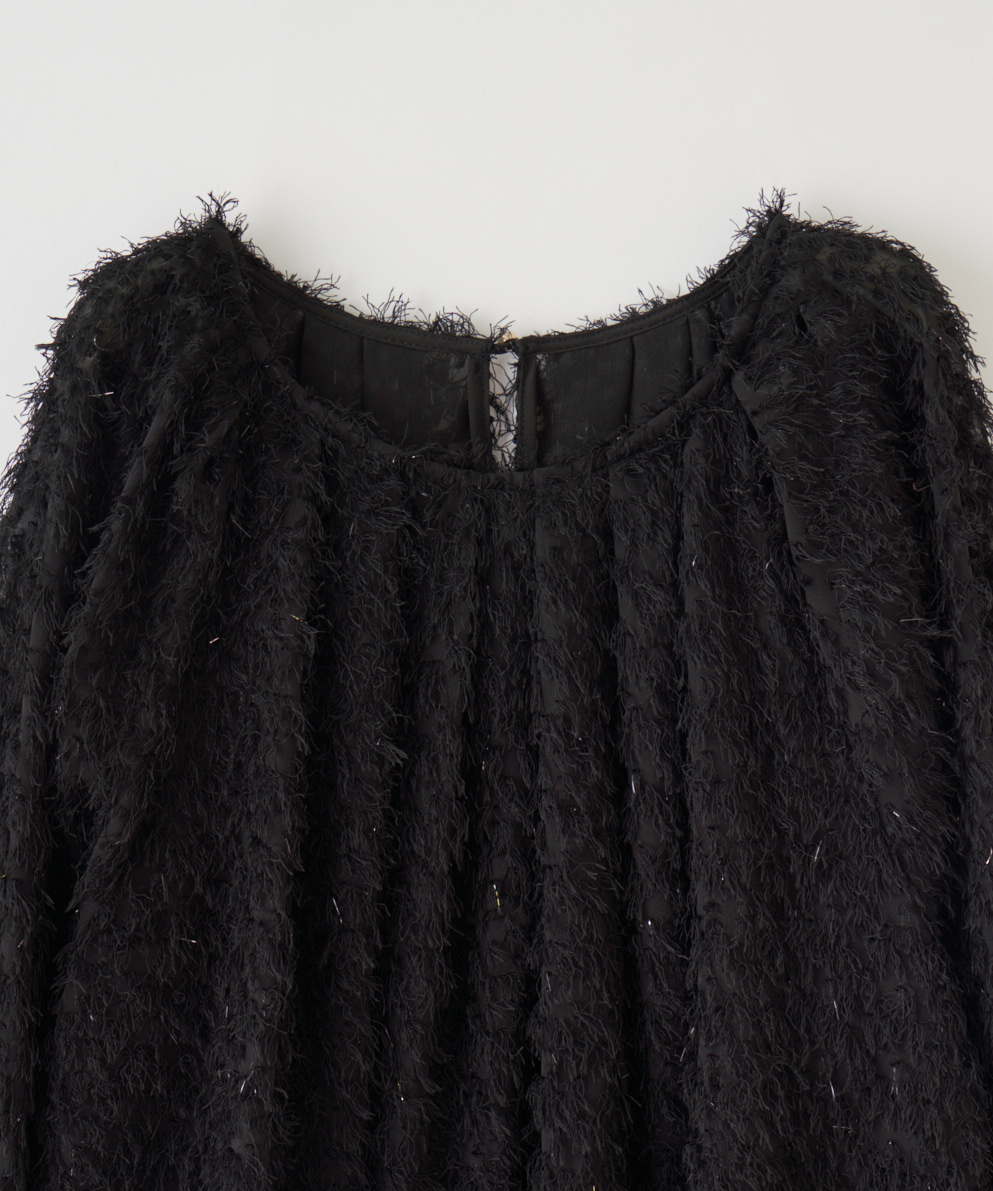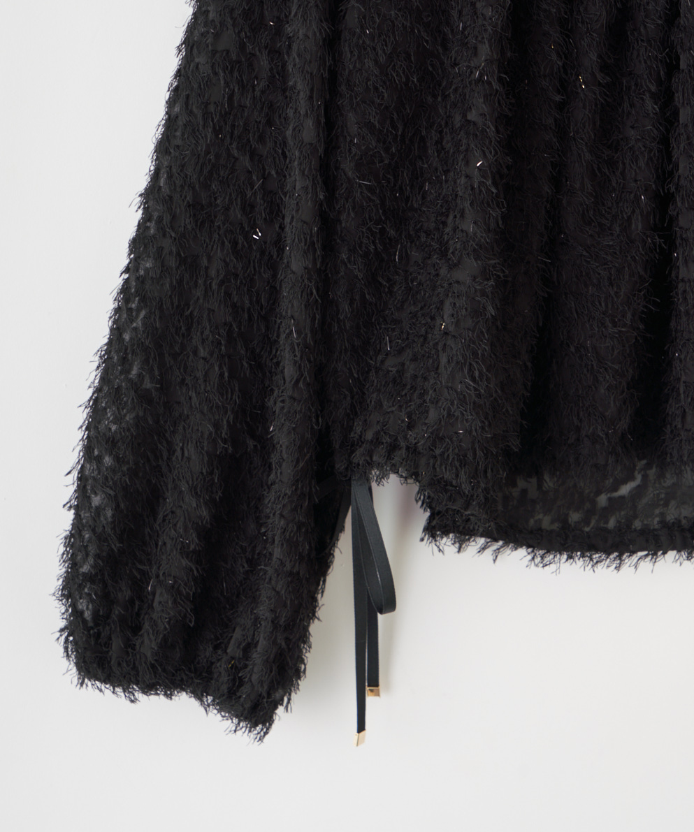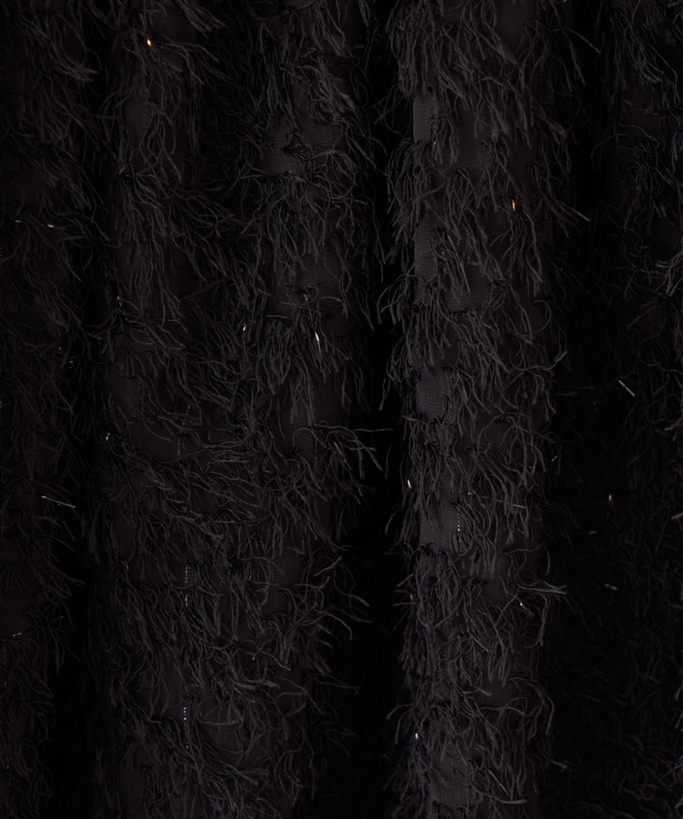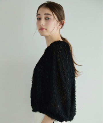 ・ラメ糸の光沢が映える毛足長めのカットジャカードで、1枚で華やかに決まる主役素材です。