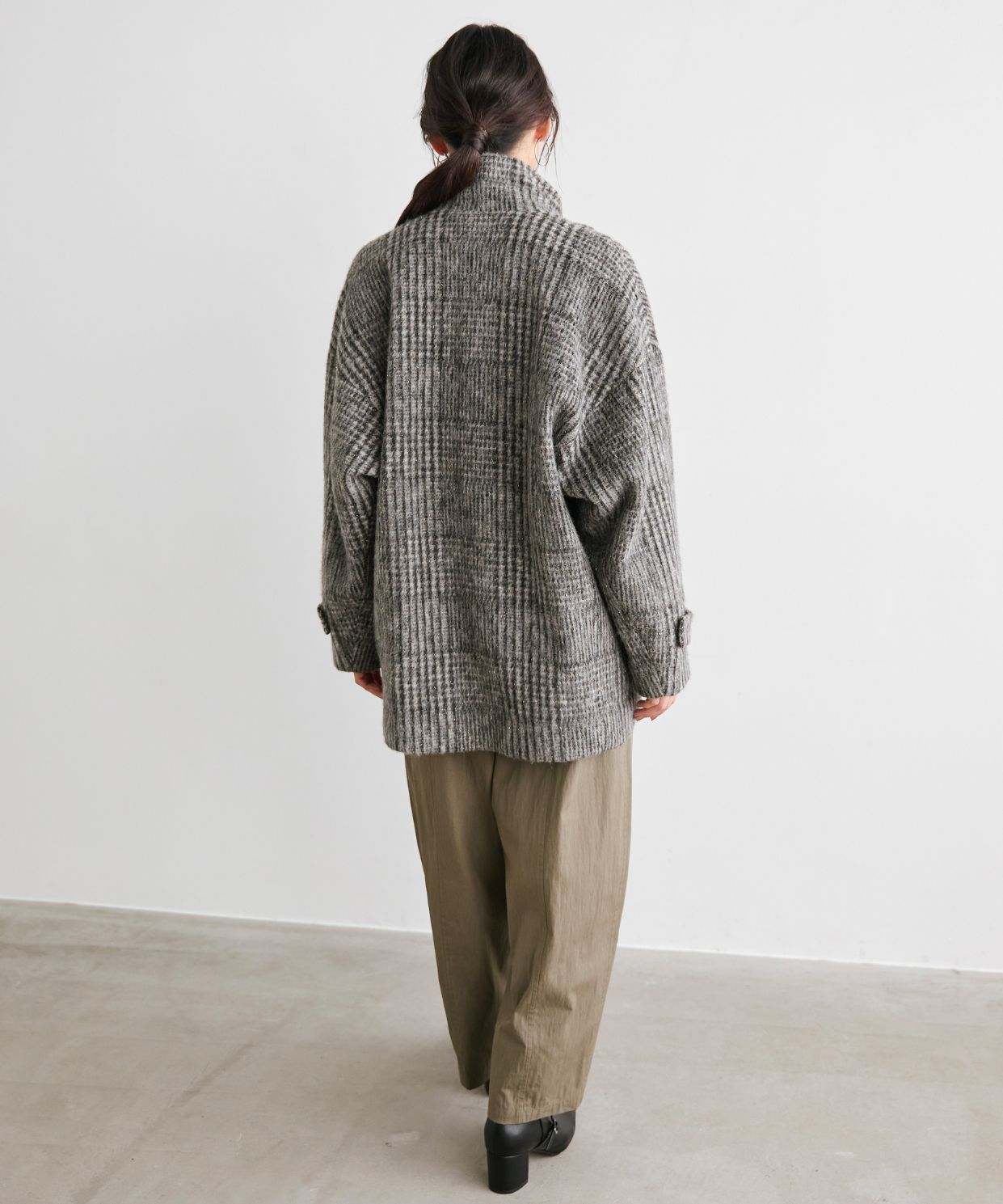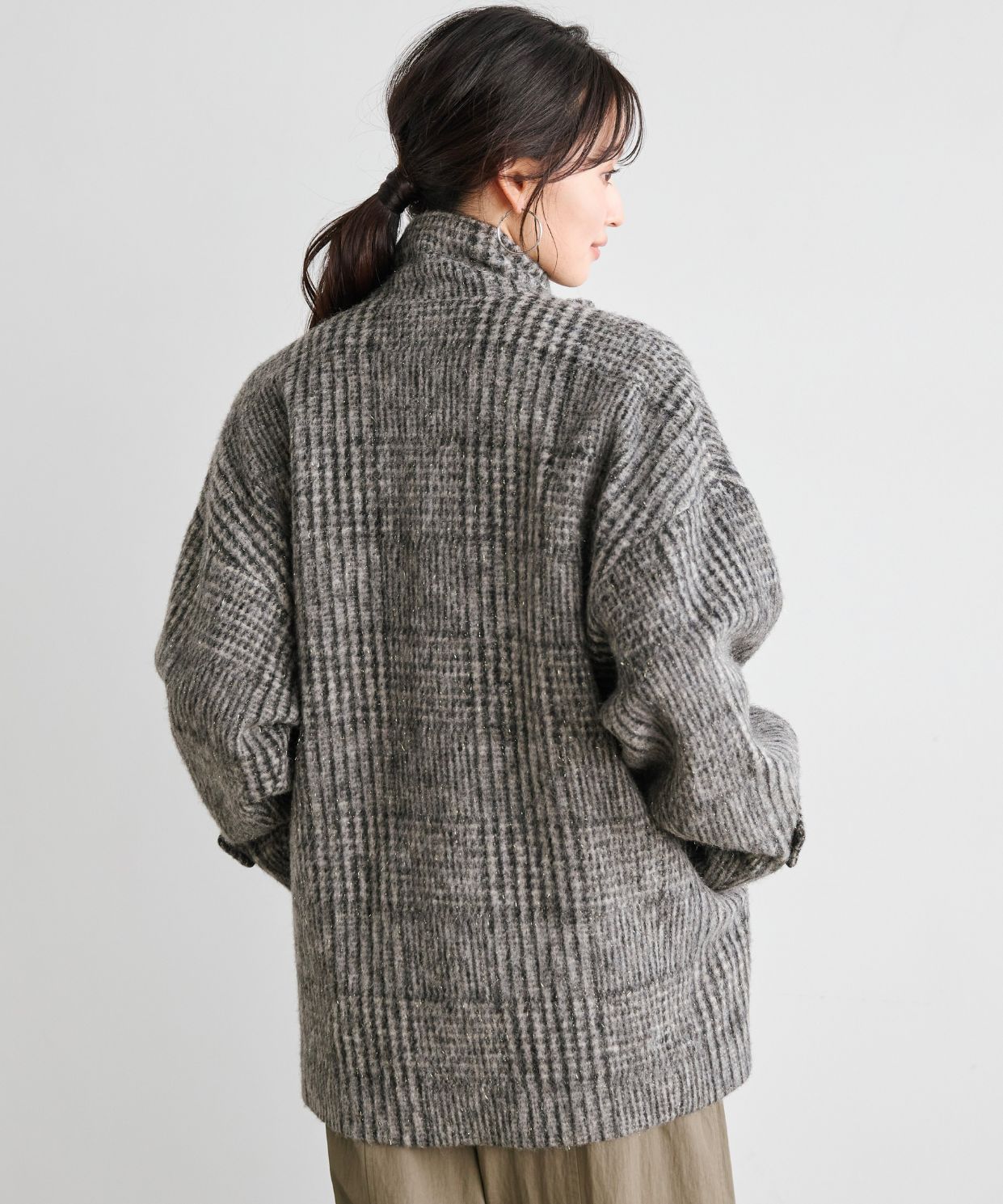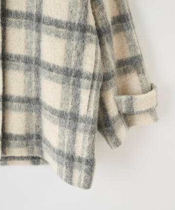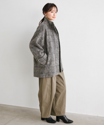 ・後袖ぐりにゆとりを多めに入れてコロッとしたボリュームのあるシルエットを作っています。袖はゆったりしているので厚手のニットを中に着てもかさばらないのも嬉しいポイントです。