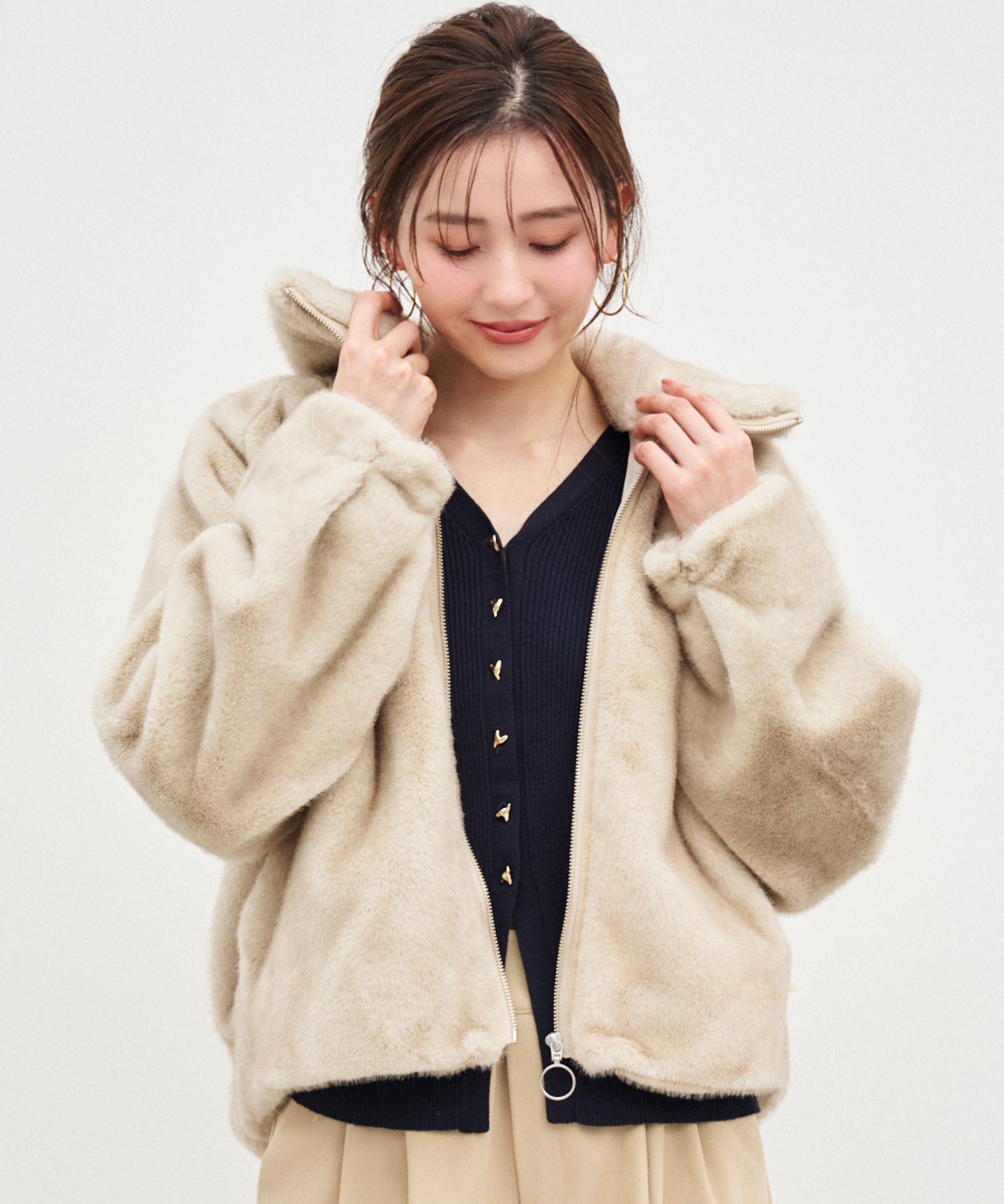 【着用感】:とても軽くて暖かい。衿が大きく、小顔効果があります。
