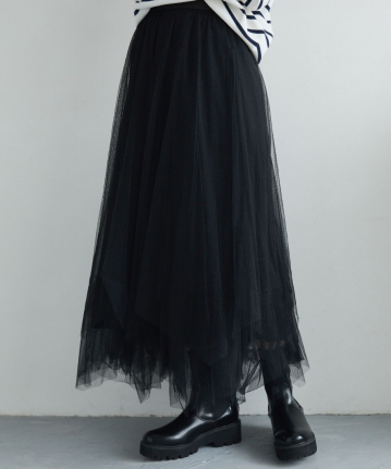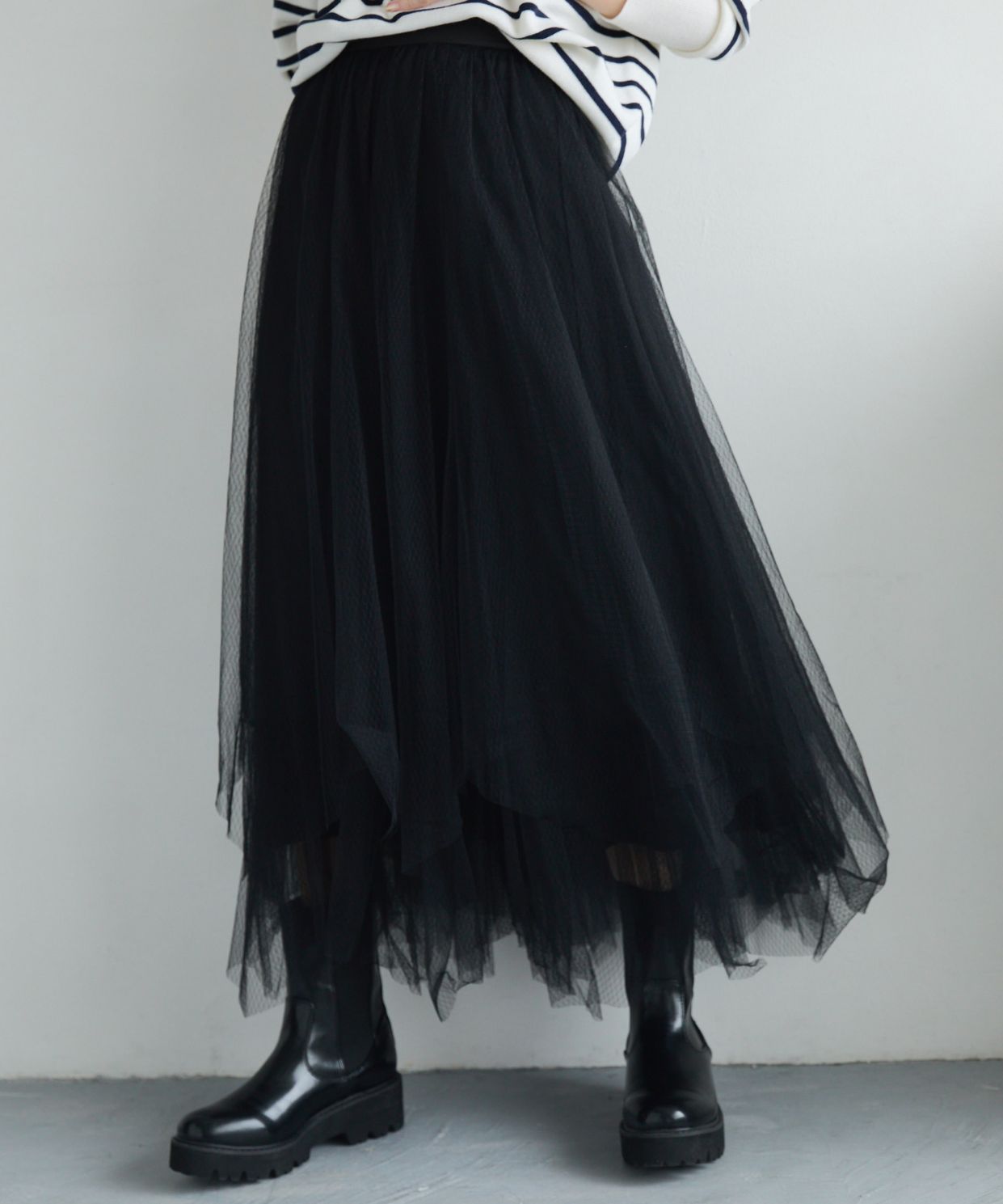 【着用感】:イレギュラーな裾デザインで華やかに見える。