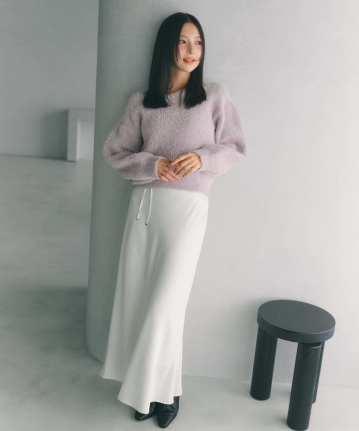 【おすすめスタイリング】:丈短めのふわふわ素材のニットで着ると冬らしく着用いただけます -