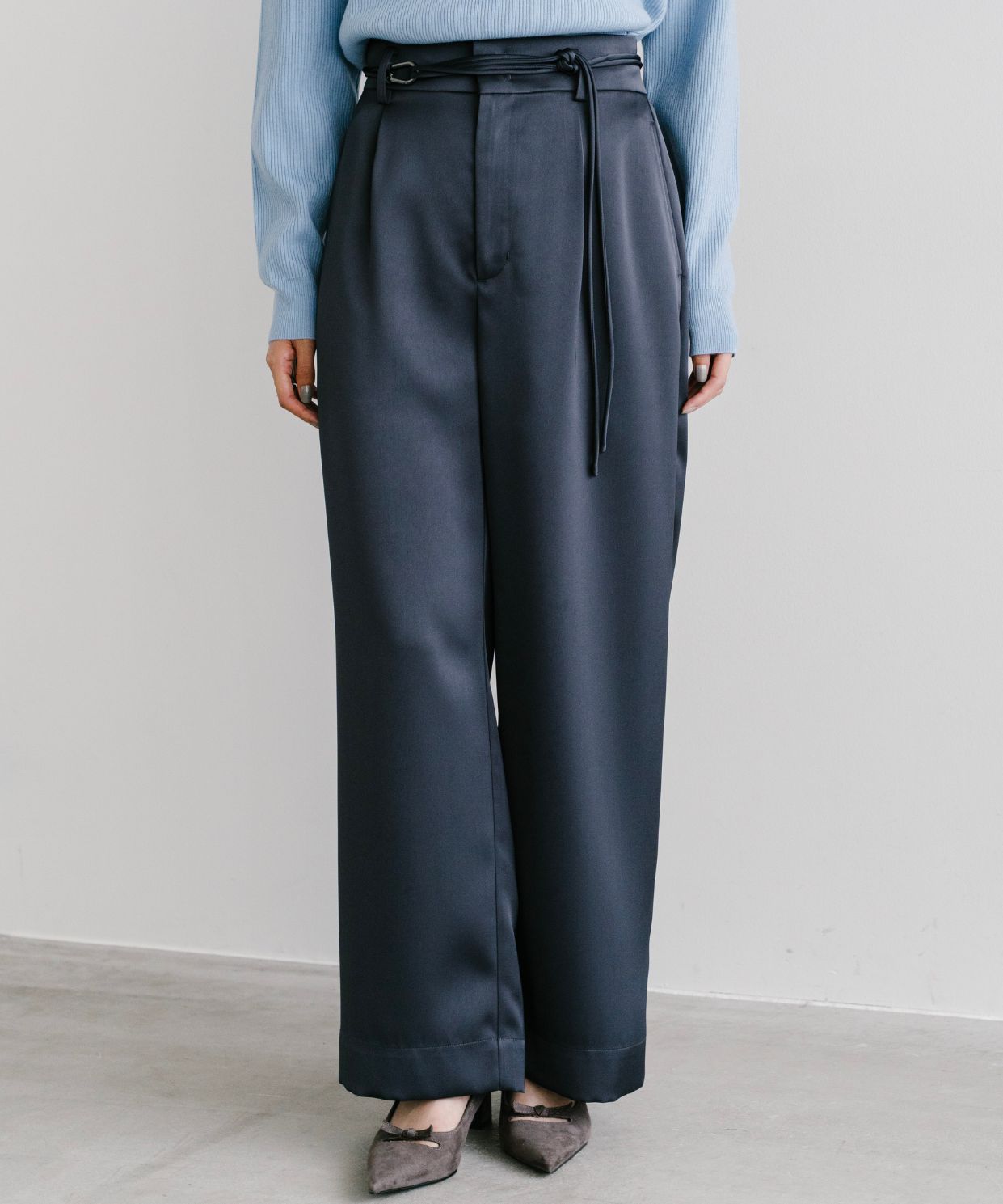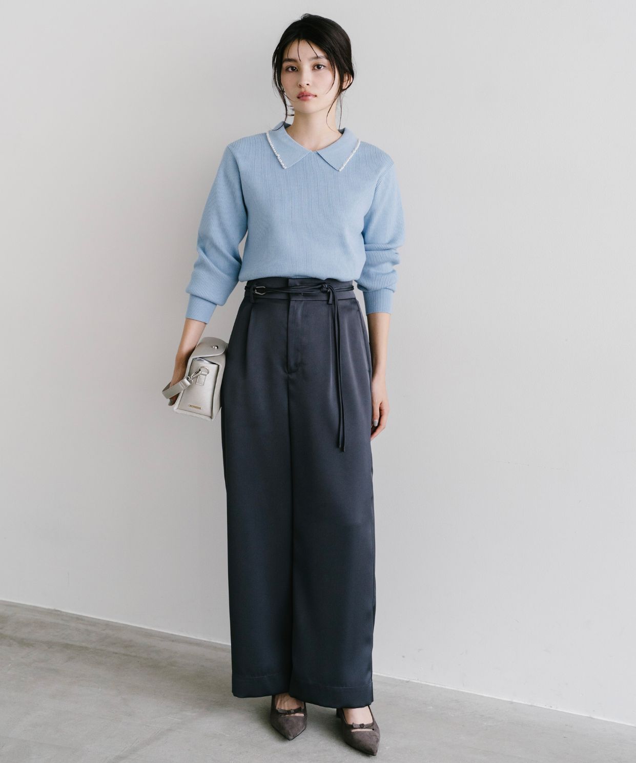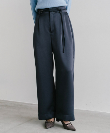 【素材感】:落ち感のあるサテン素材。他のサテンアイテムよりもしっかりとした生地感で、光沢感は強すぎない。