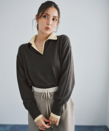 【おすすめスタイリング】:色違いのポロニットを2枚重ねたトレンドスタイル。 -