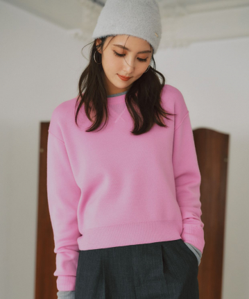 【おすすめスタイリング】:色違いを2色重ねたスタイリング、特にピンクとグレーを重ねるのがオススメ。 -