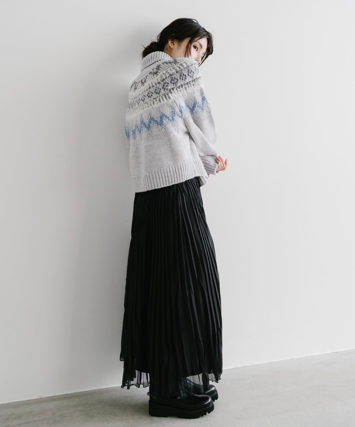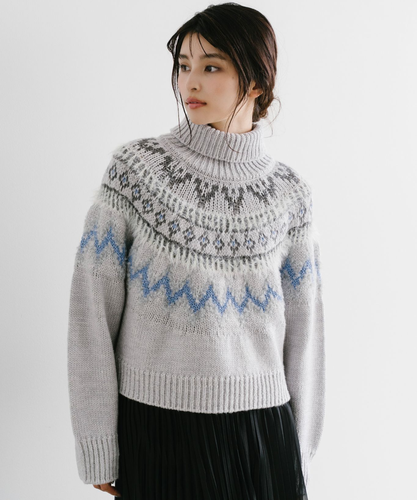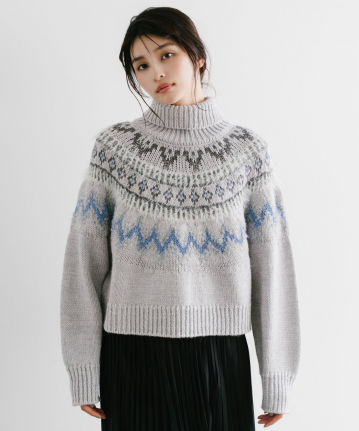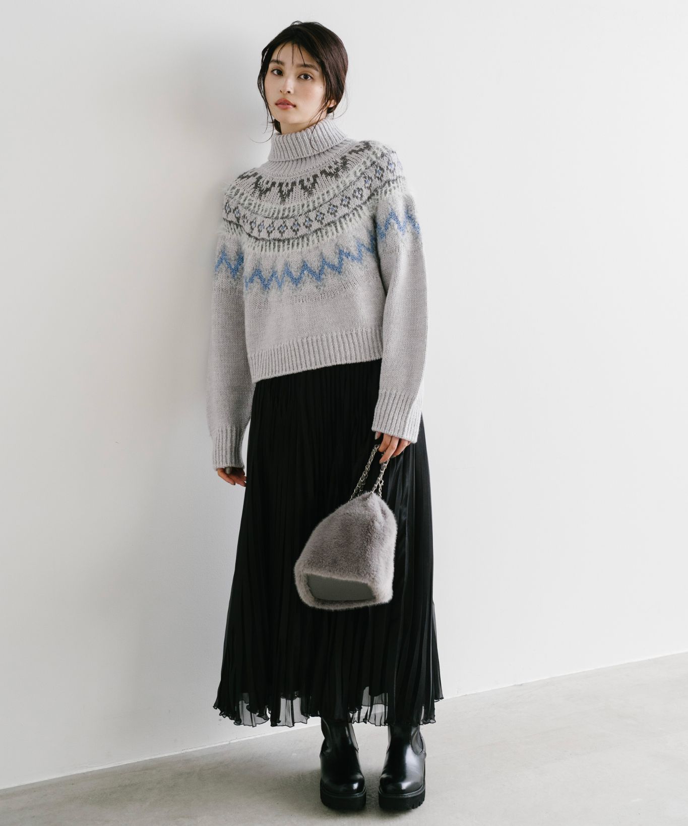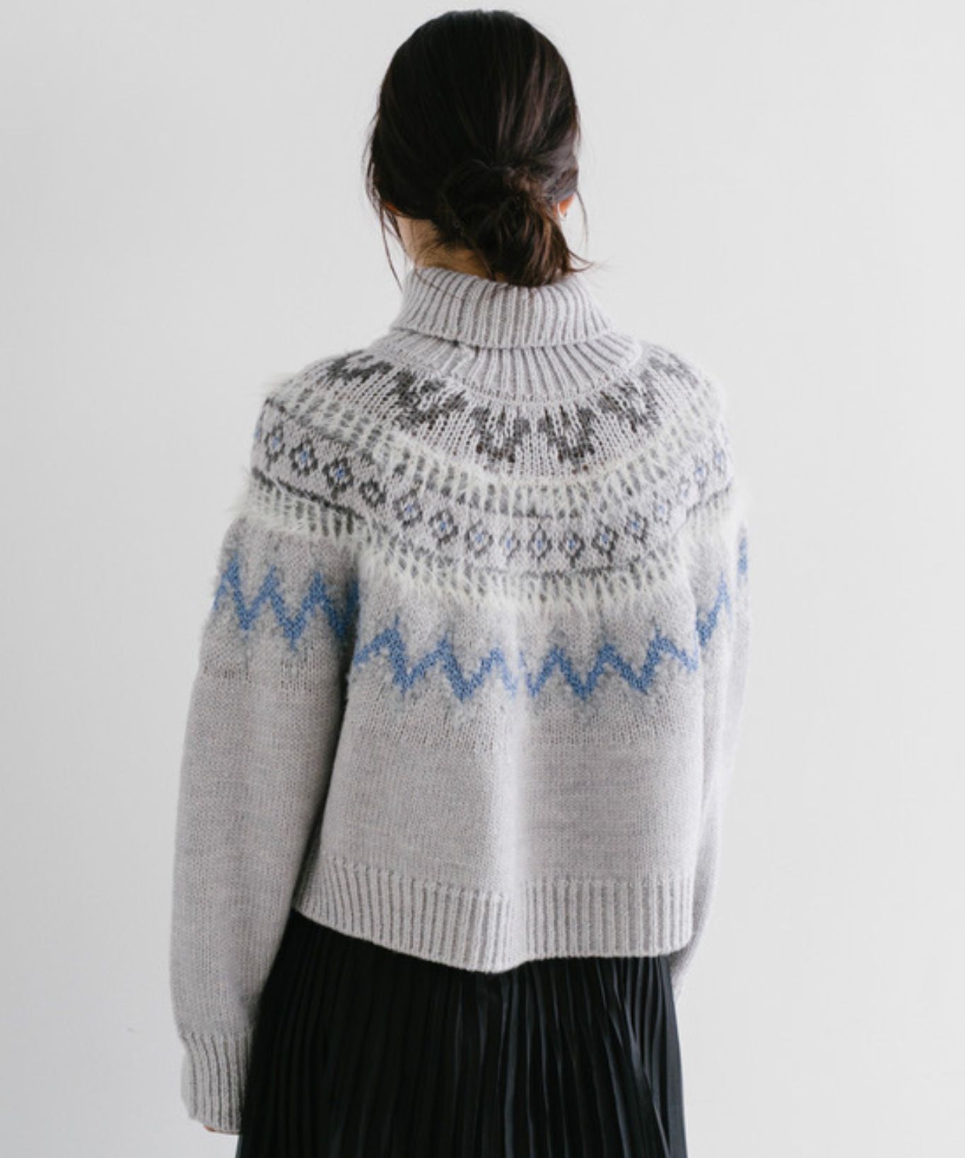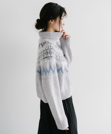 【サイズ感】:首は全て隠れる高さのタートルネックです。丈は骨盤下でトレンド感のある丈短ニットです。