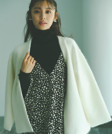 【素材感】:柔らかな毛吹き感のある素材。内側は目の詰まったニット素材で、インナーに毛が着きにくい。