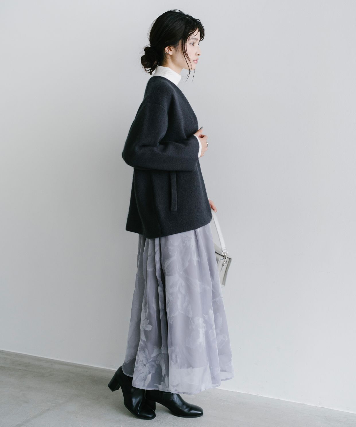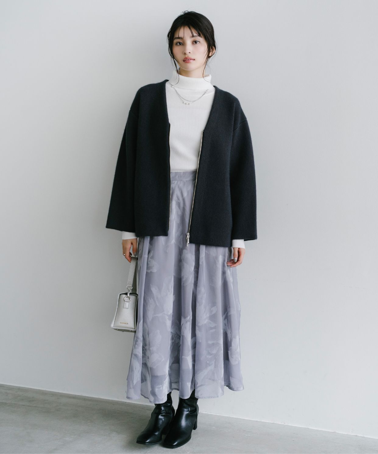 【おすすめスタイリング】:どんなものにも合わせやすいですが、ボトムはスカートだったらタイトスカートやセミマーメイドスカートなどがおすすめです!