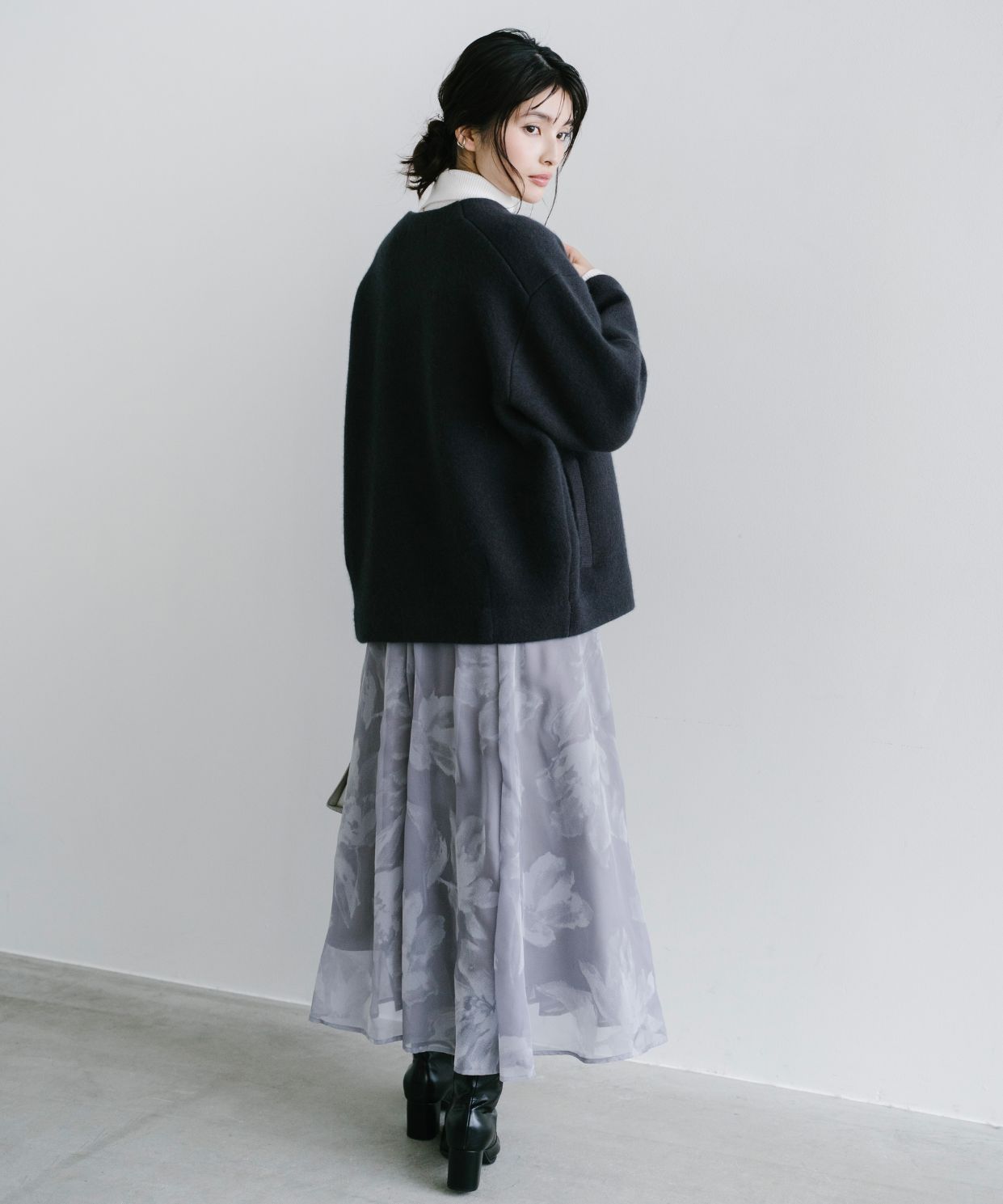 【おすすめのスタイリング】:何でも合わせやすい。シンプルでコーデの邪魔をしない羽織りなので、ワンピースや華やかなコーデのアウターとしてもおすすめです! -