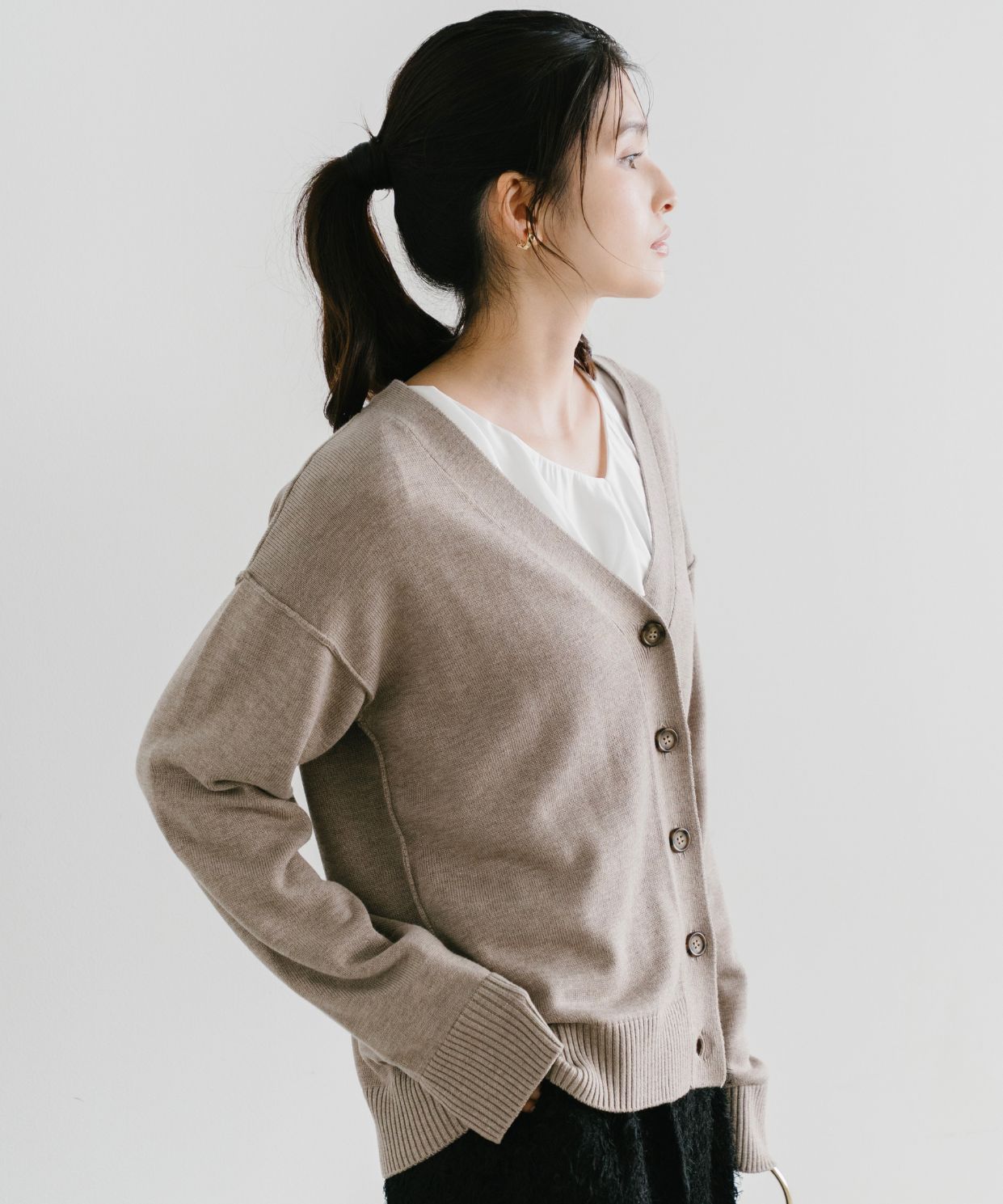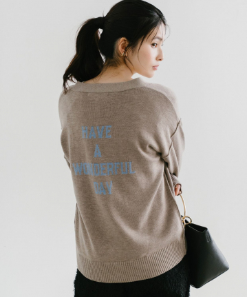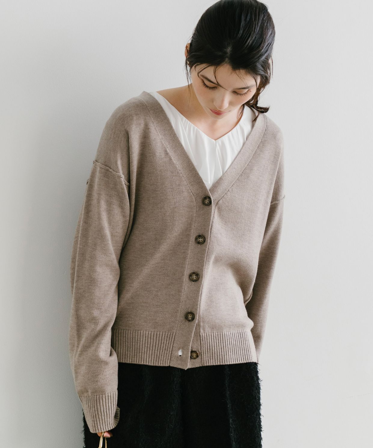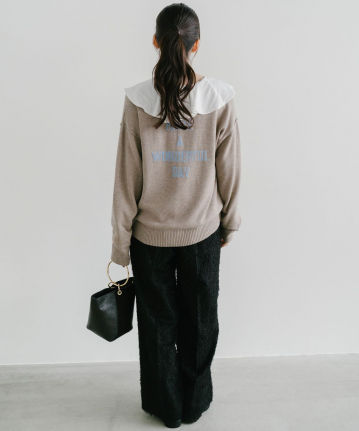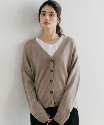 【おすすめスタイリング】:シャツやブラウスとのレイヤードスタイル。ボトムはスカート、パンツどちらにも合わせやすいと思います。