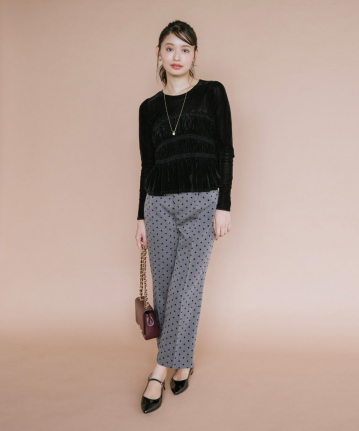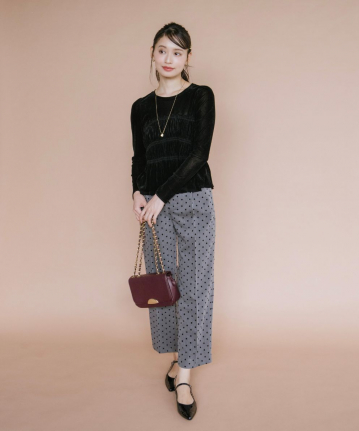 【着用感】:脚のラインをカバーしながらすっきり見えるシルエット。フロッキードットで甘すぎず着られる。