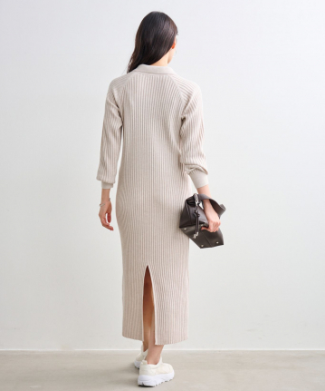 【着用感】:ストレッチ性抜群で楽ちん。スキッパー衿とIラインシルエットですっきり見えるが、リブ幅が広いので身体のラインを拾いすぎずに着られる。