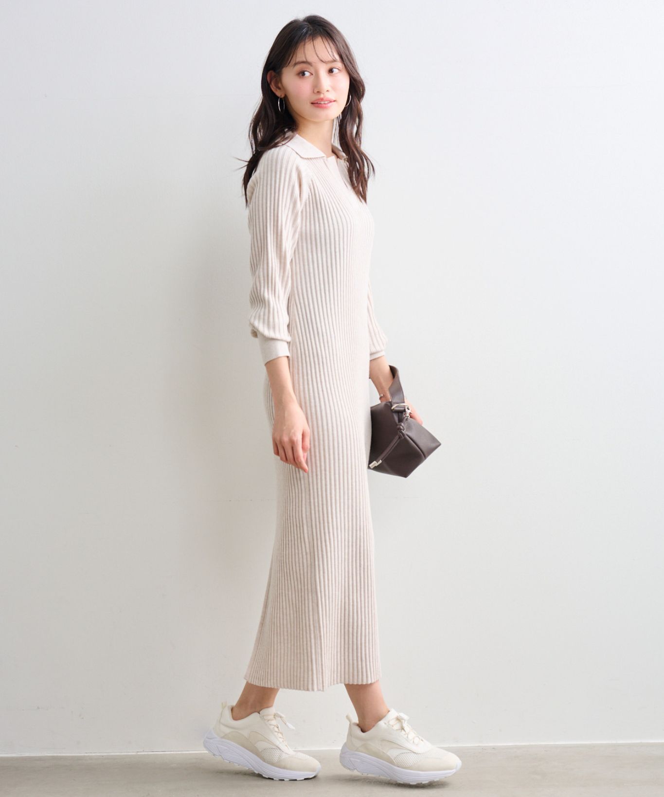 【着用感】:程よくフィットする。身体のラインは拾わず綺麗なIラインシルエット。