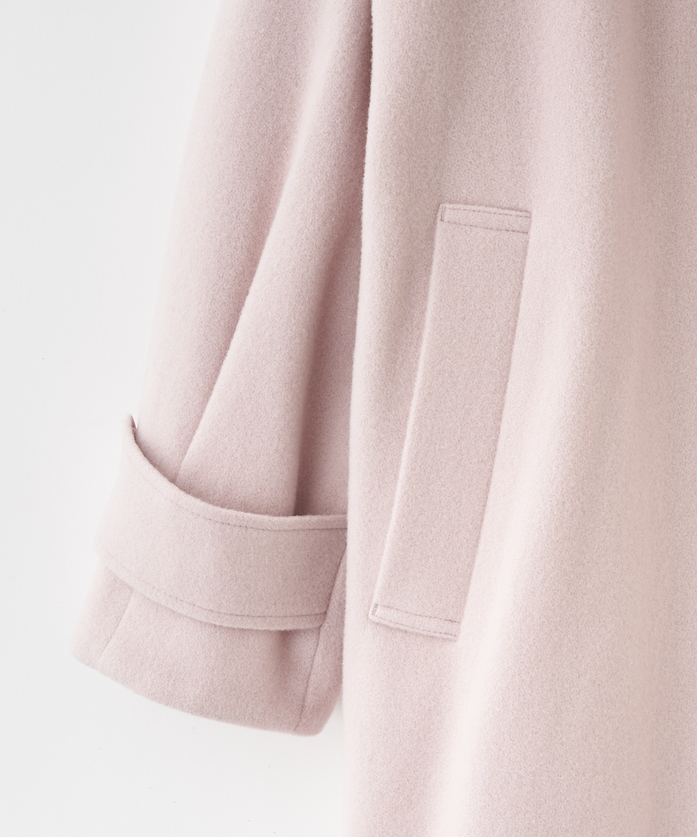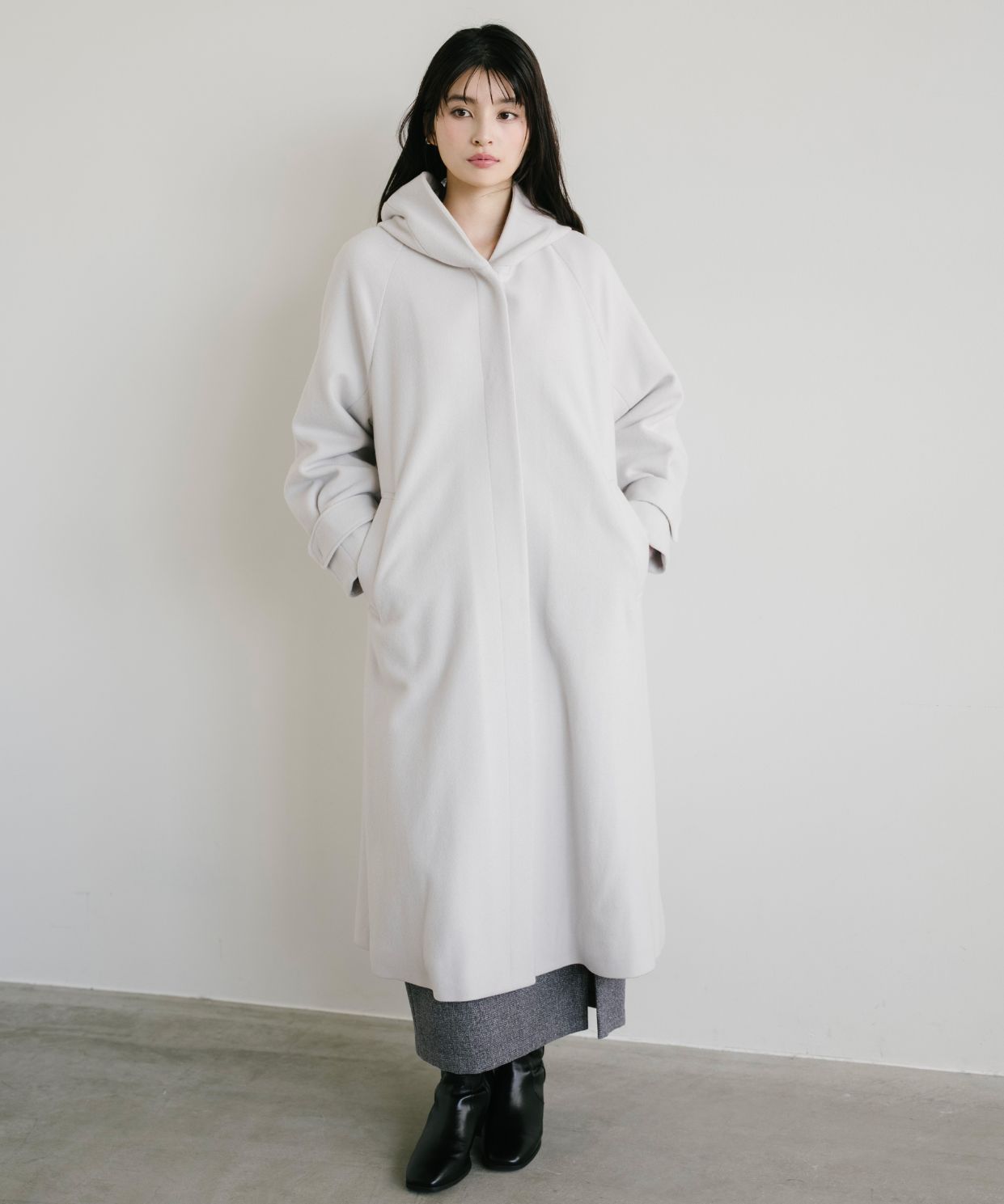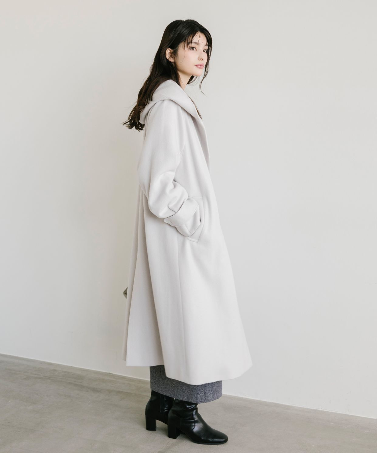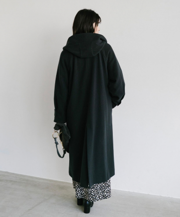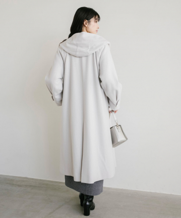 ・さっと気負いなく羽織れ、今年らしい雰囲気を纏えるフード付きのロングのウールコートです。