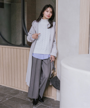 【おすすめスタイリング】:柄物やレースなど表情感のある素材のボトムスをコートの裾から覗かせるスタイリング -