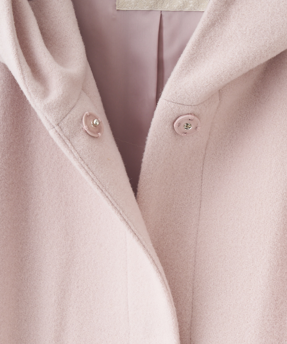 ・ややカジュアルな印象になりがちなフードのデザインは、スッキリとしたシルエットで、主張しすぎないくるみスナップを使用しているので開けた時の印象もきれいめで大人っぽさをキープ。