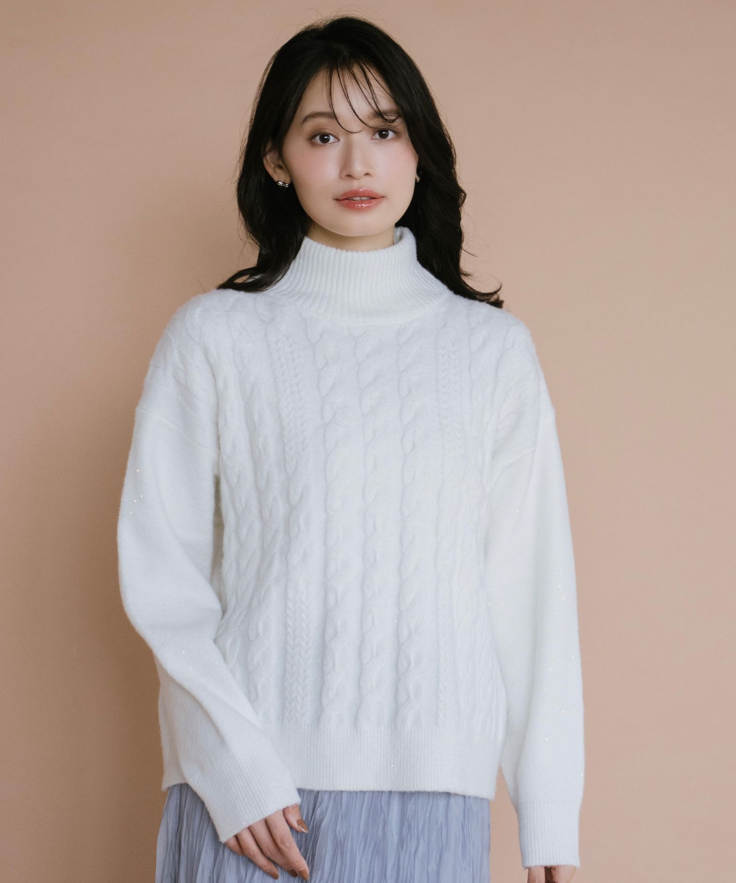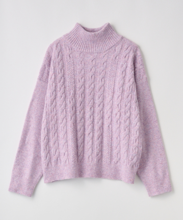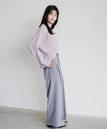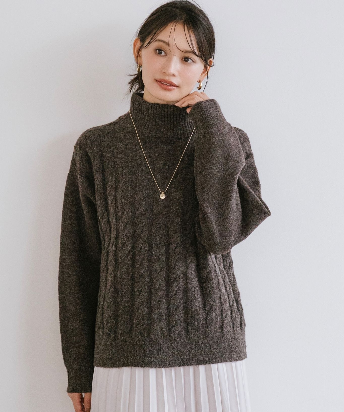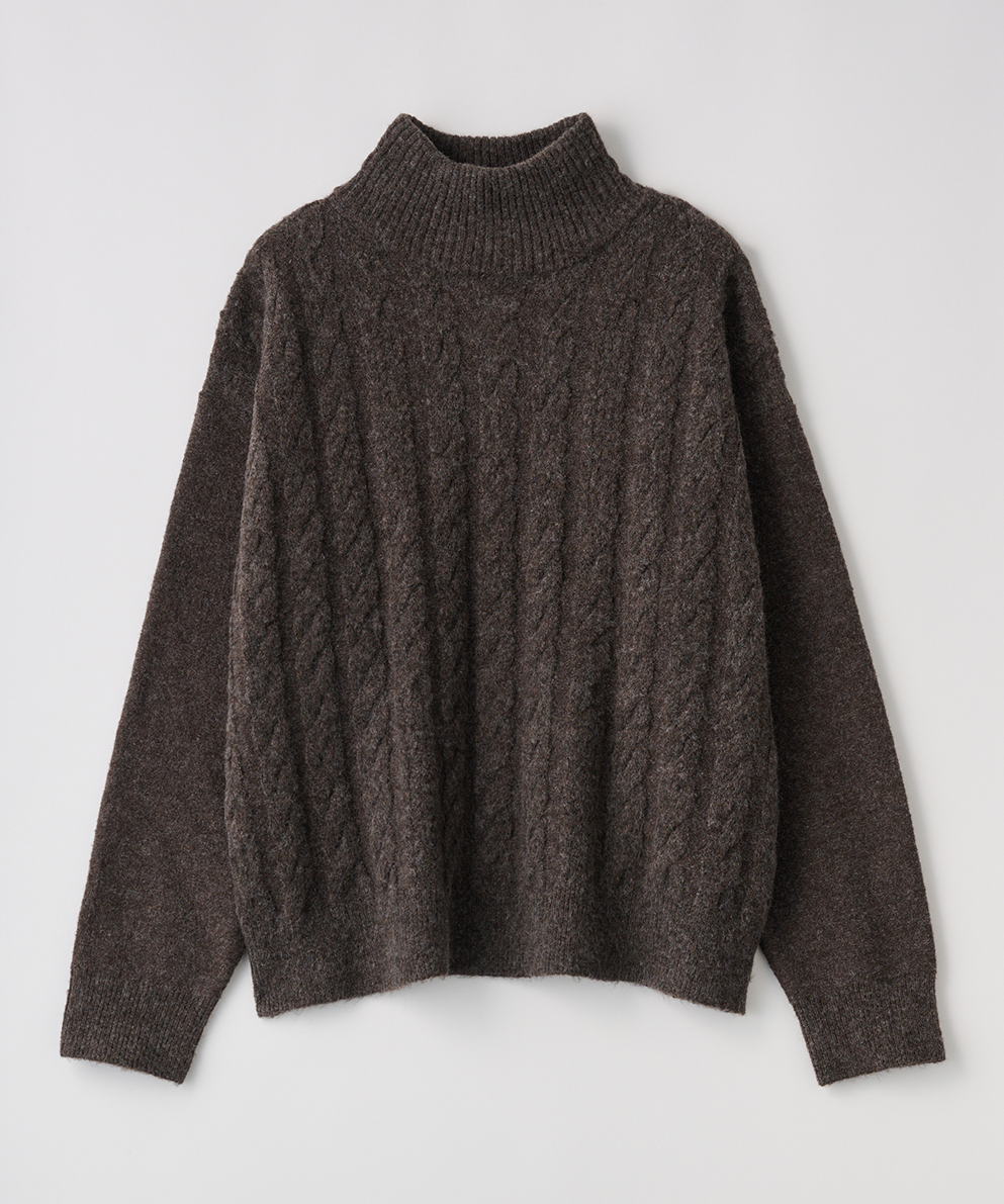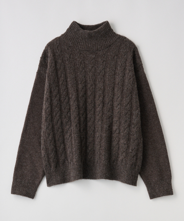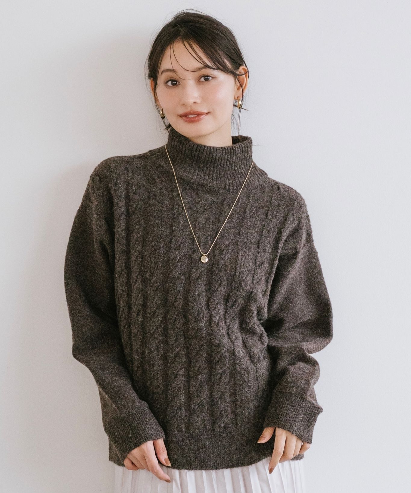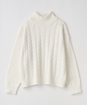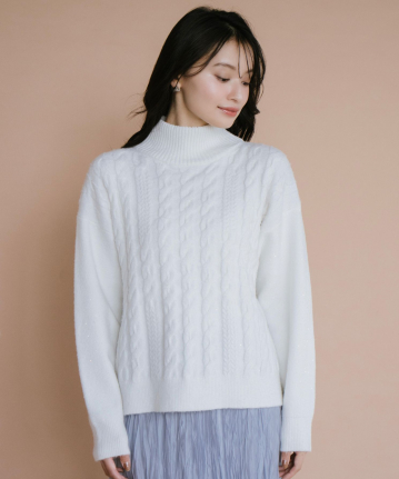 ・立体感あるケーブル編みとゆったりシルエットで、高見えと体型カバーを両立させました。