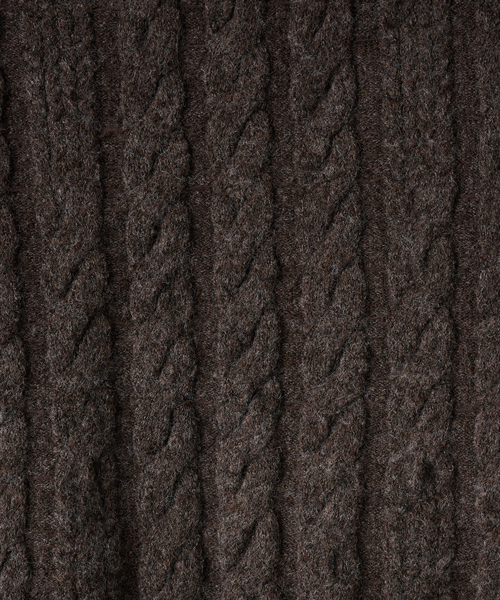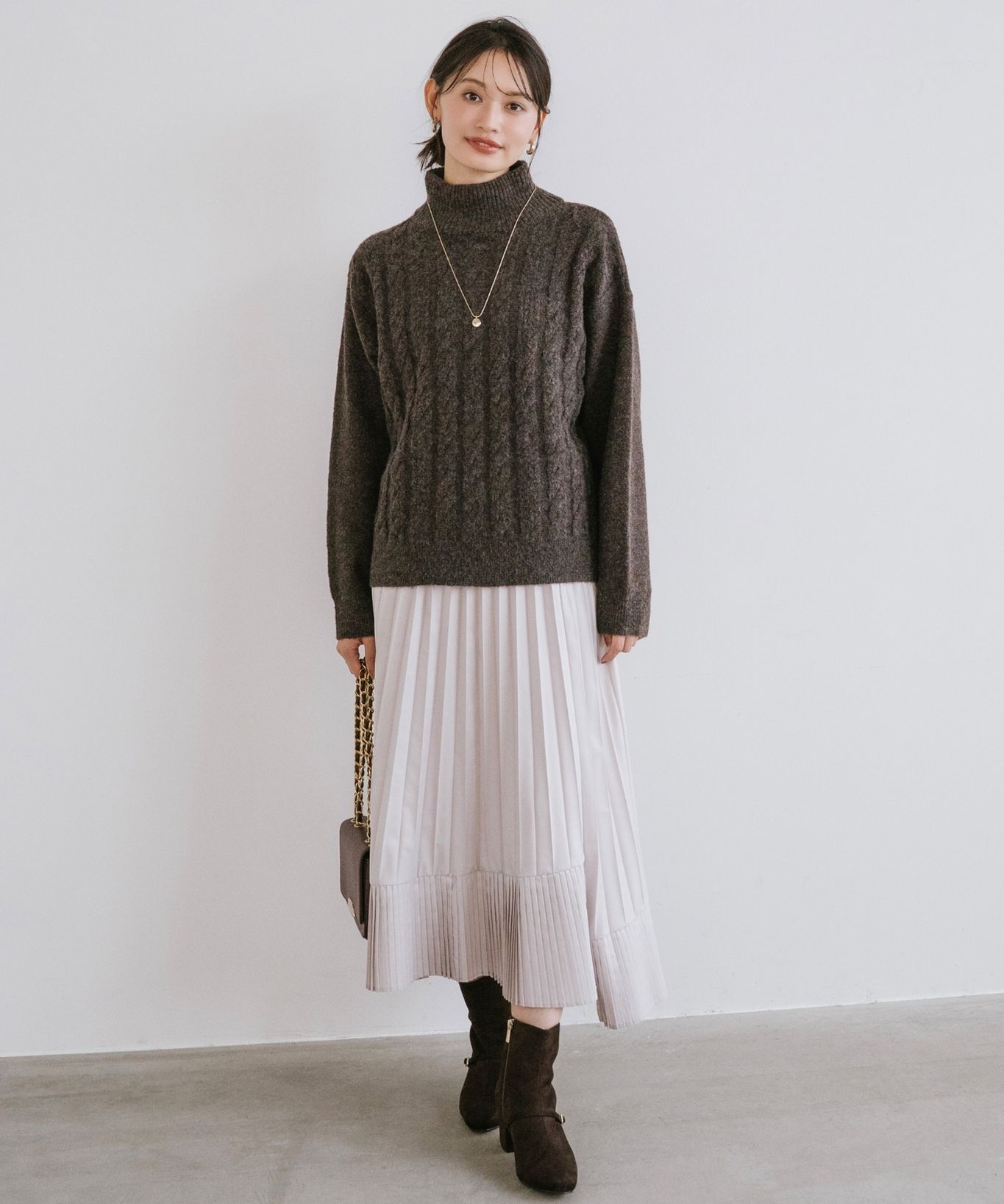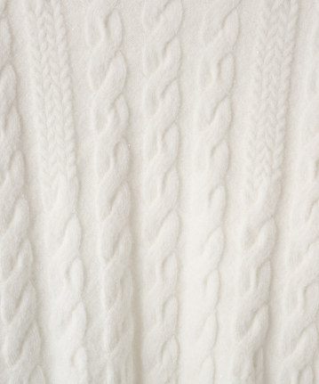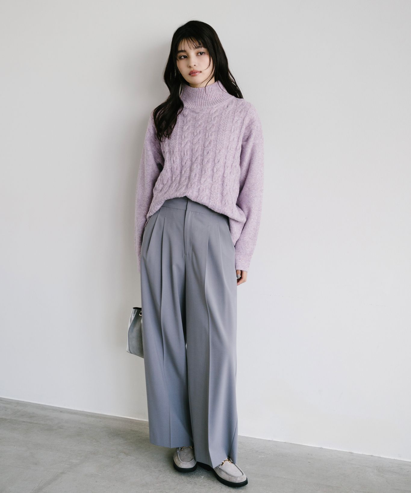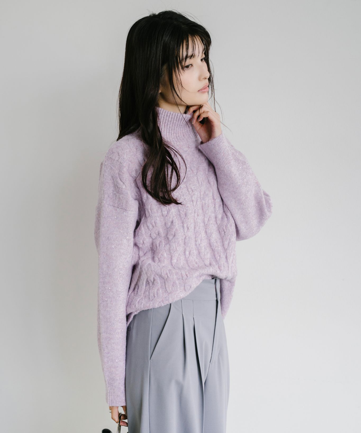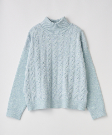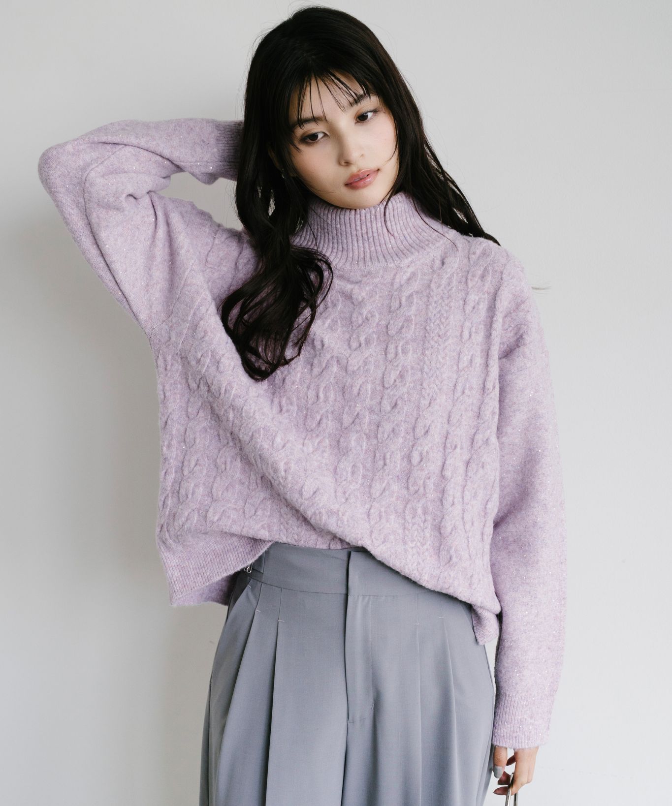 ・立体感あるケーブル編みとゆったりシルエットで、高見えと体型カバーを両立させました。