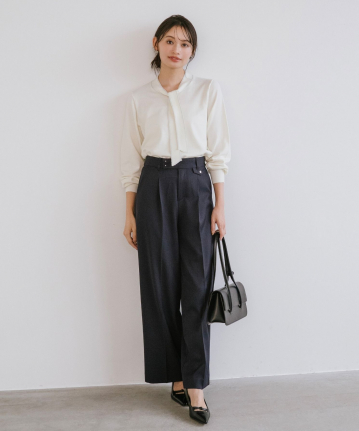 ・首元で結ぶボウタイが顔周りを華やかに演出し、アクセサリーなしでもサマになります。