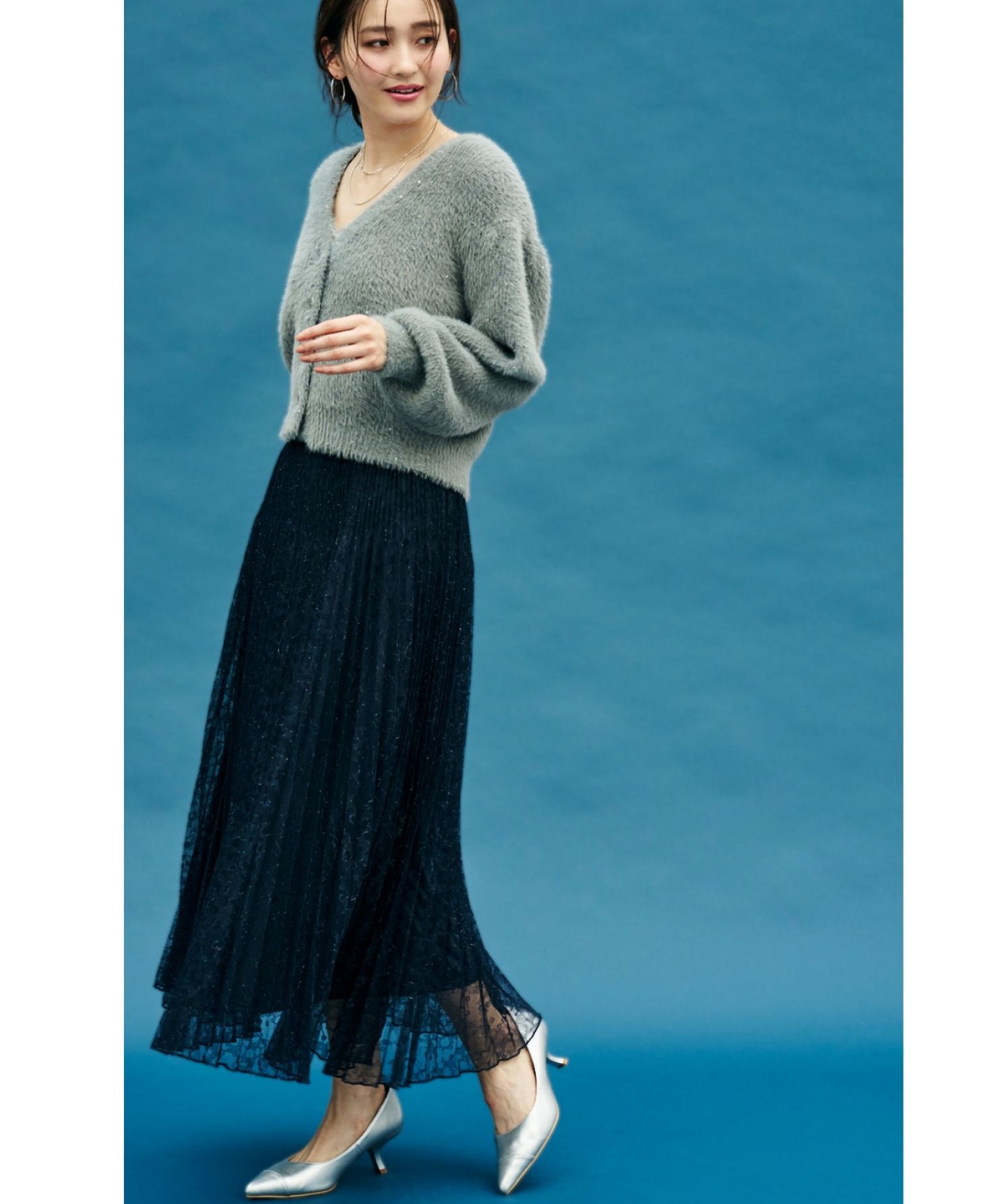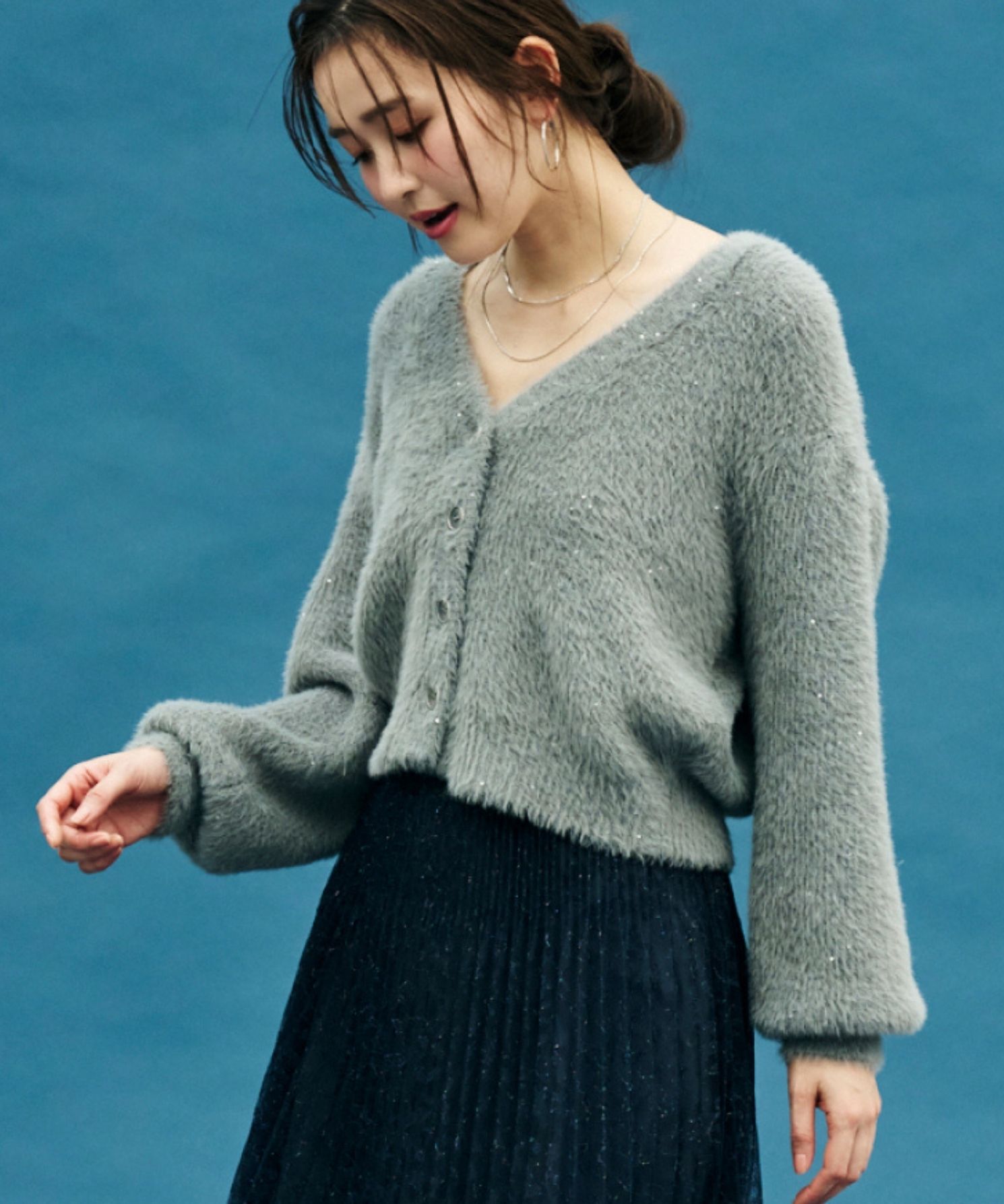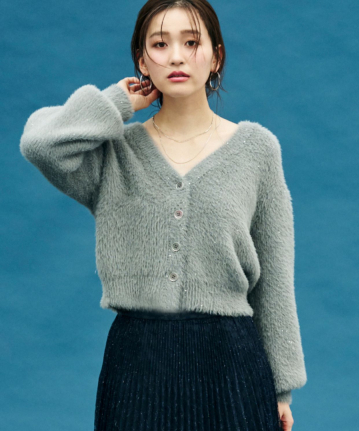 ・ふわふわと柔らかなタッチのシャギー素材が目を引く、Vネックニットカーディガンです。