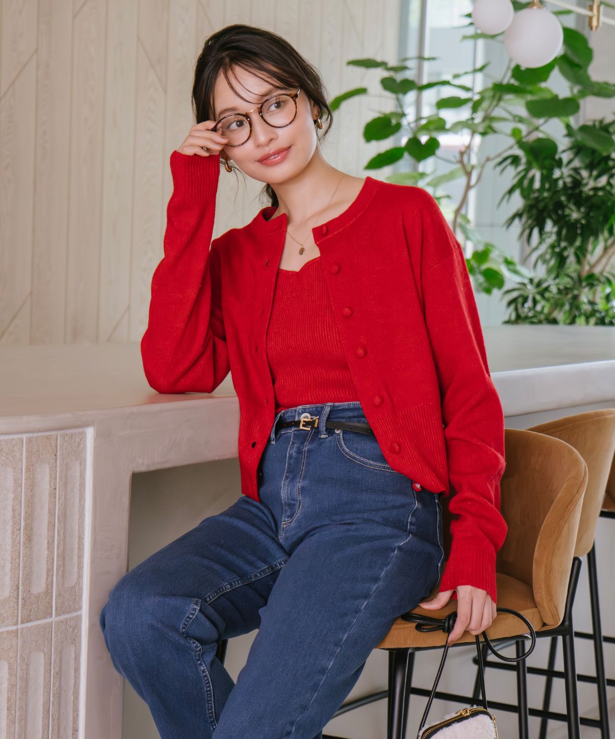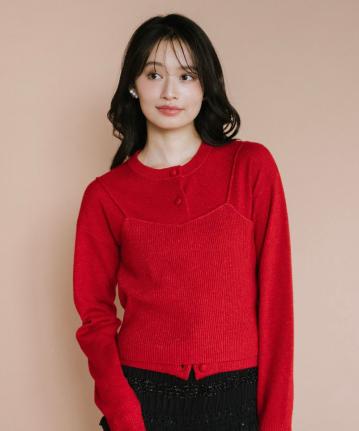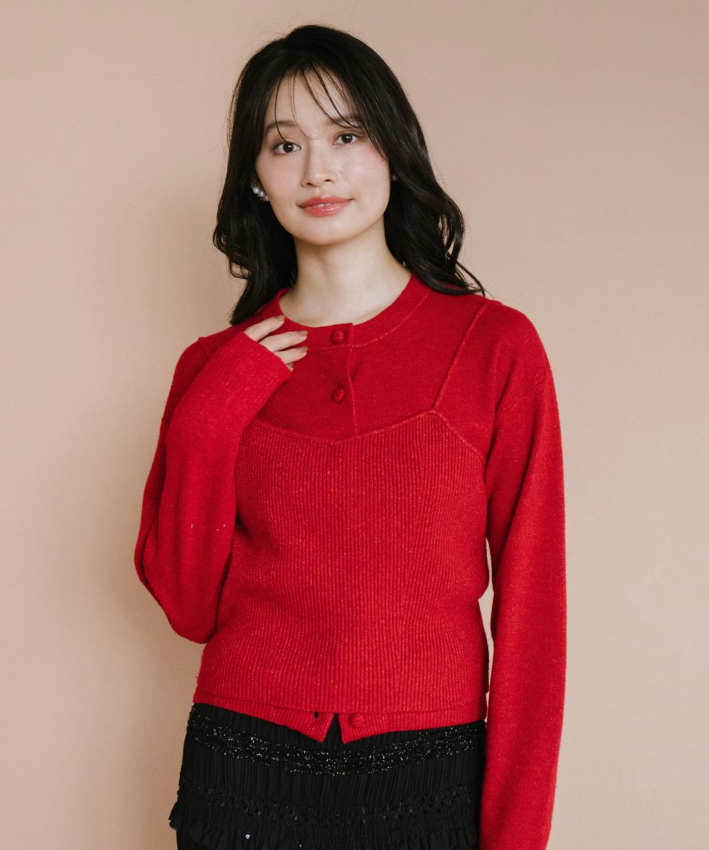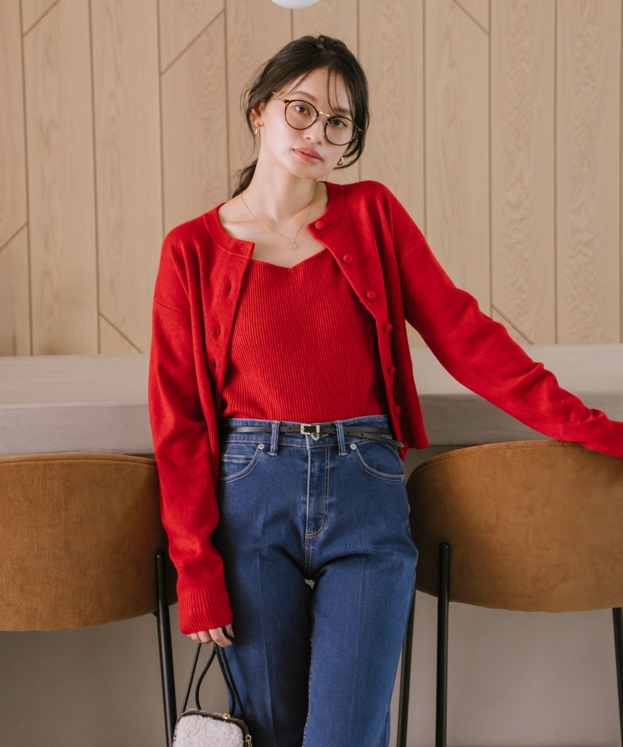【着用感】:カーディガン、キャミソール共にコンパクトなシルエットです。キャミソールはやや短め丈ですが、調節可能なデザインのためインナーとしてもビスチェとしても着用しやすいです。