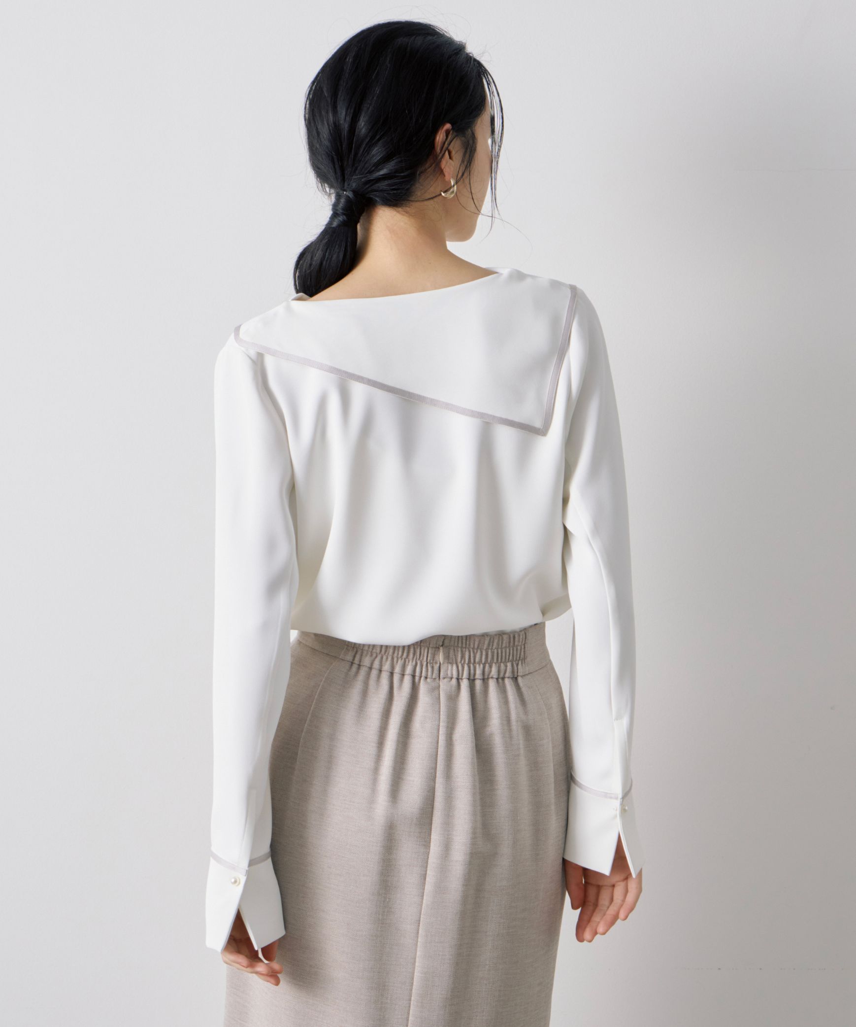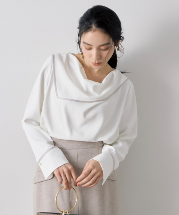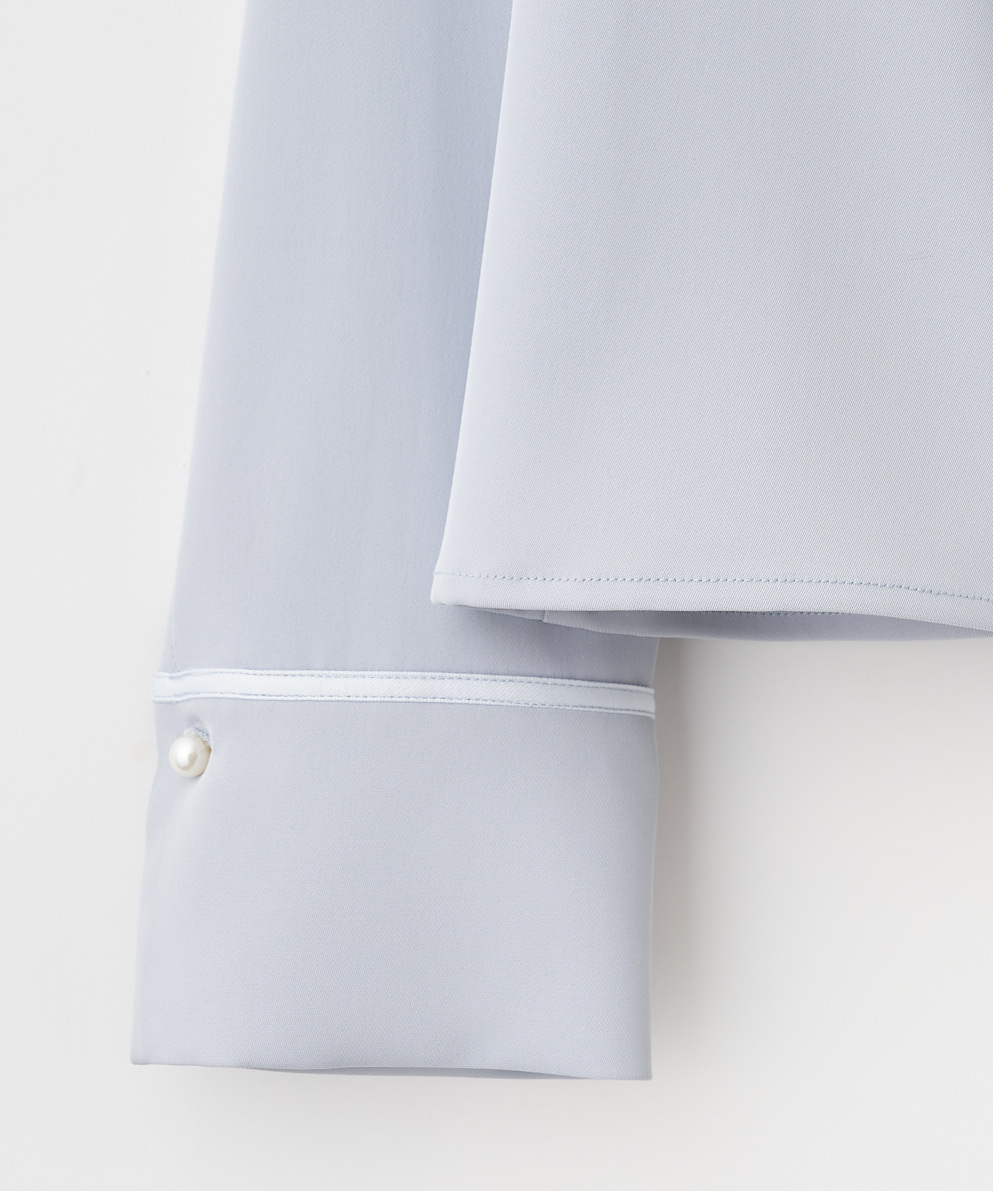 ・さりげない配色のテープ使いが華やかな印象をプラス。長めのカフスに付いたパール調のボタンが、手元を華やかに演出します。