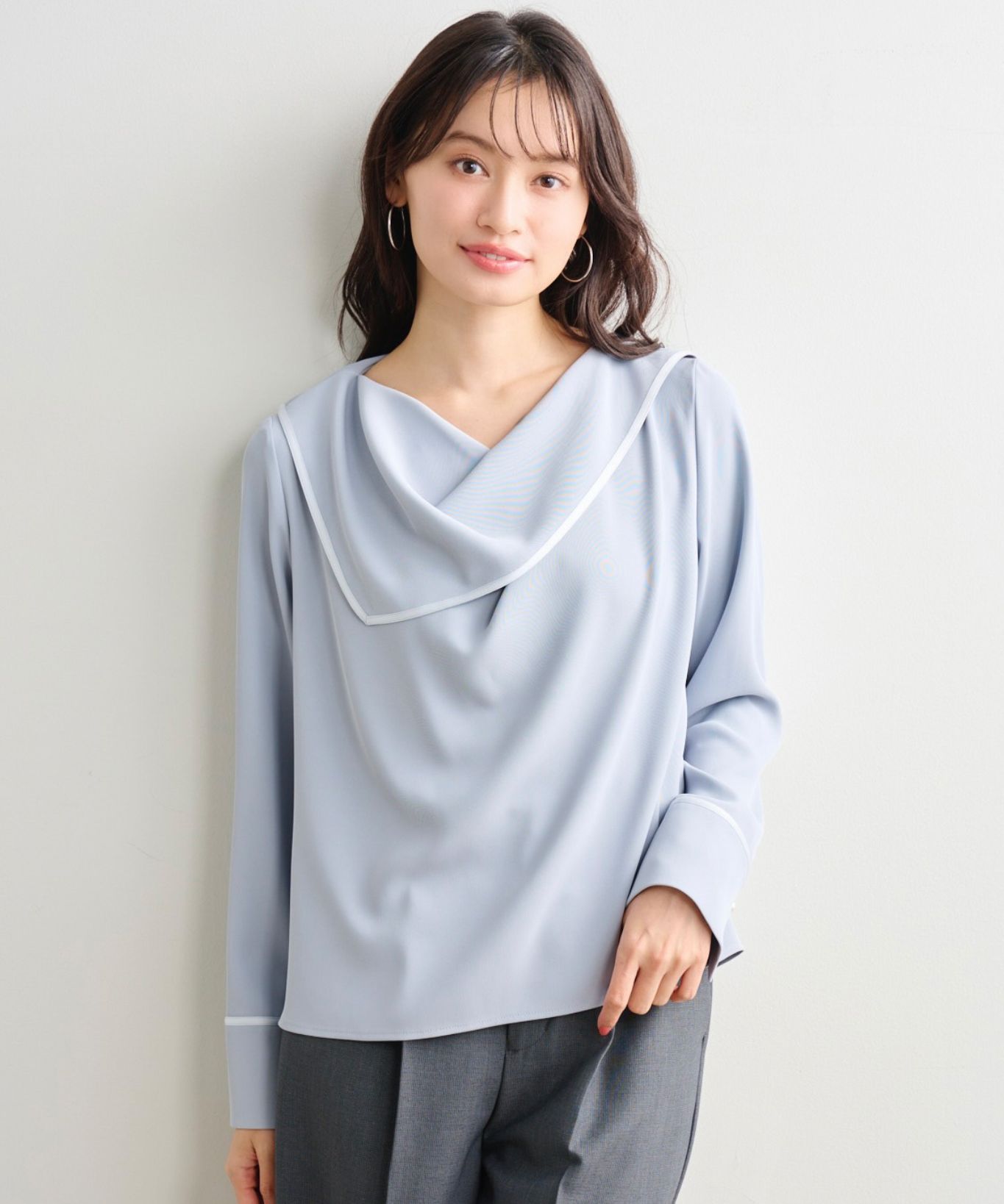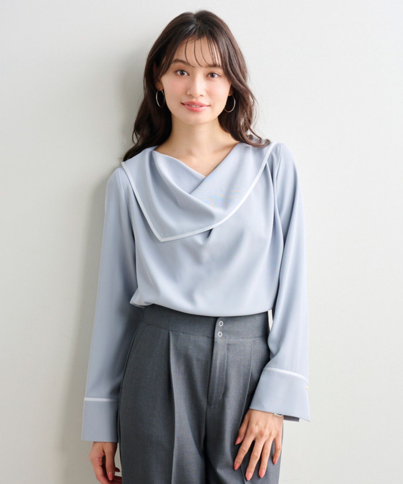 【着用感】:衿ぐりは空きすぎず、首元をすっきり見せてくれる。