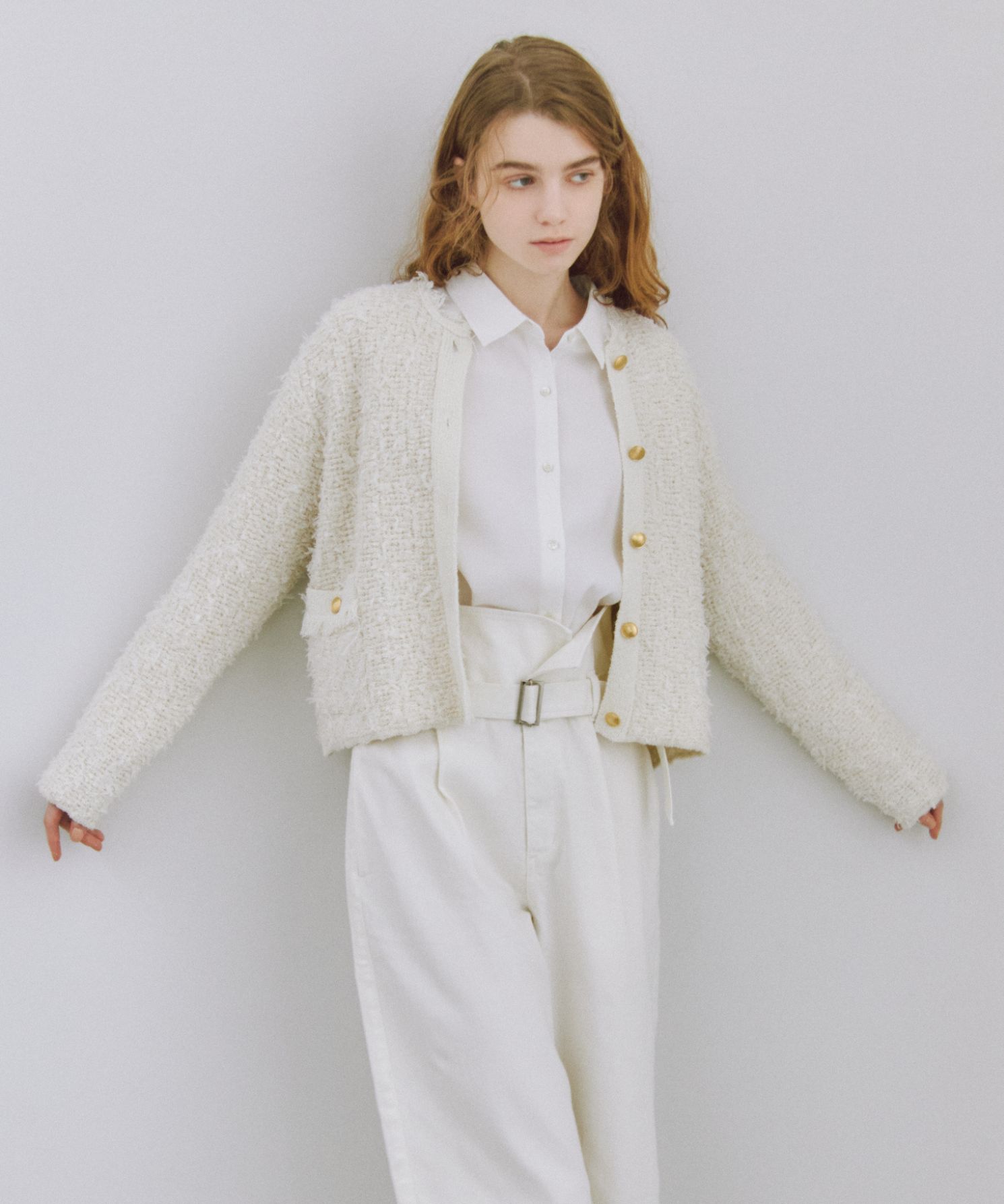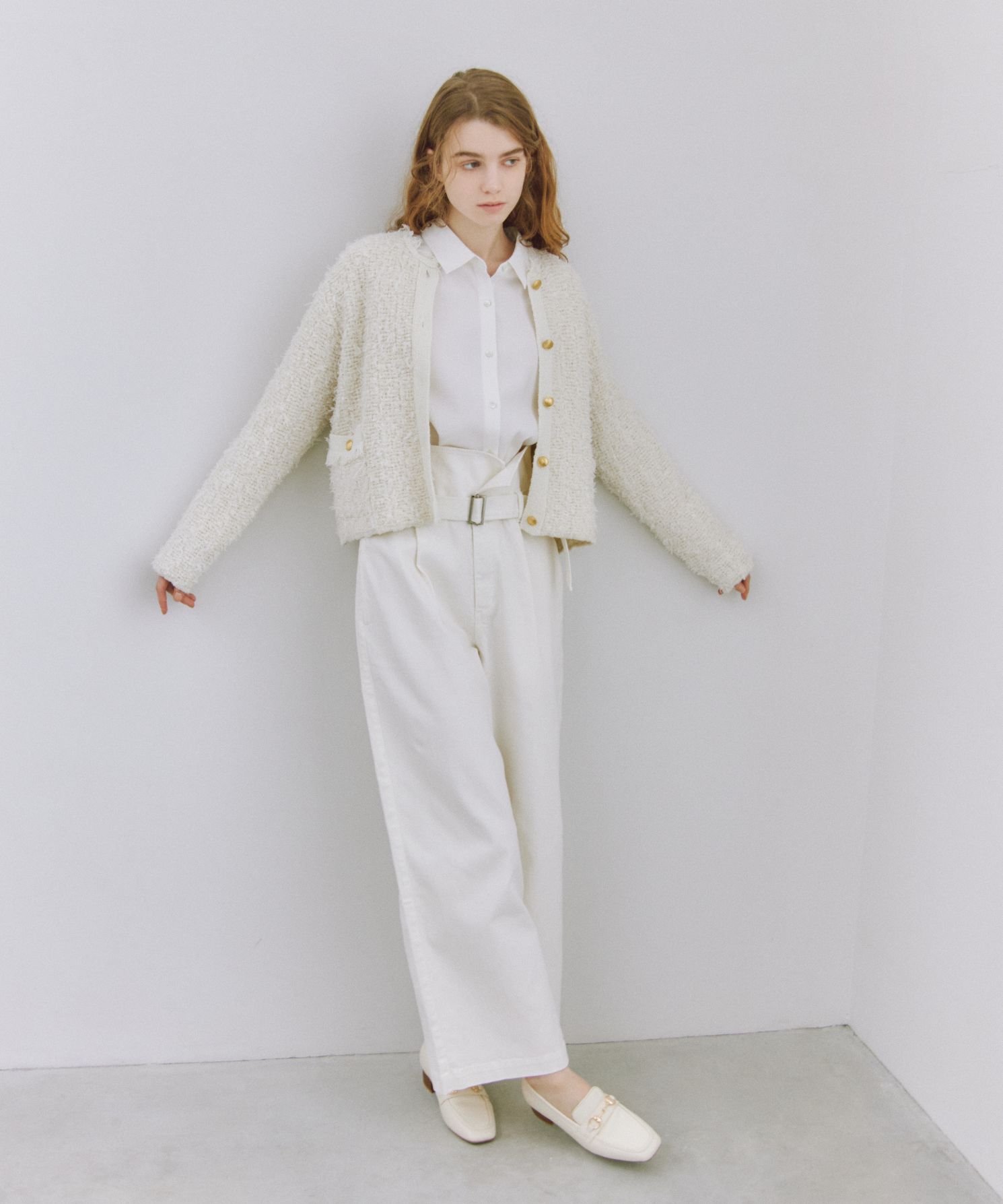 【着用感】:着丈が短めなので、ハイウエストのアイテムと合わせると◎