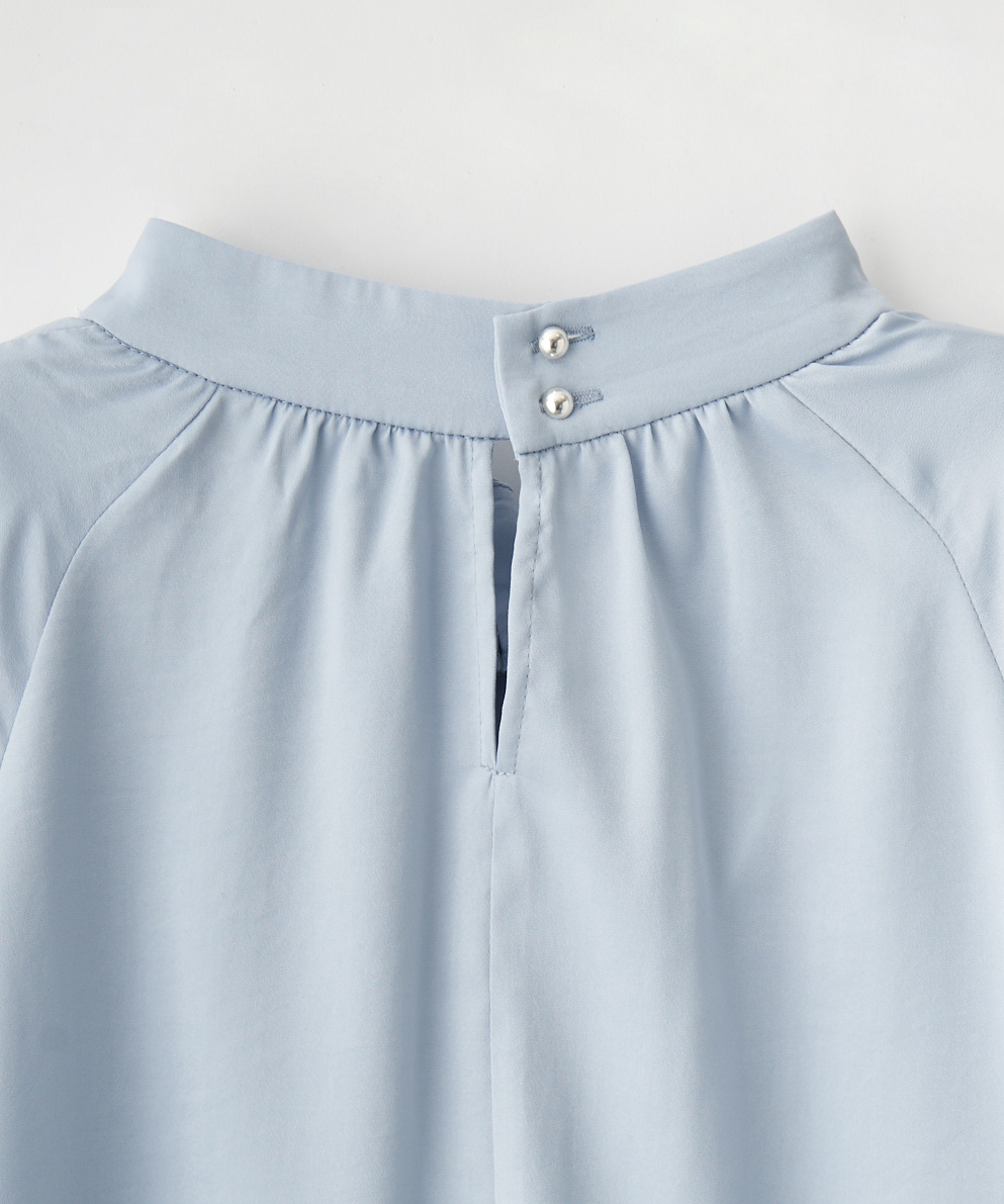 ・顔周りをすっきり見せてくれるネックデザインのブラウスです。首元にクリア釦を施しポイントにしています。