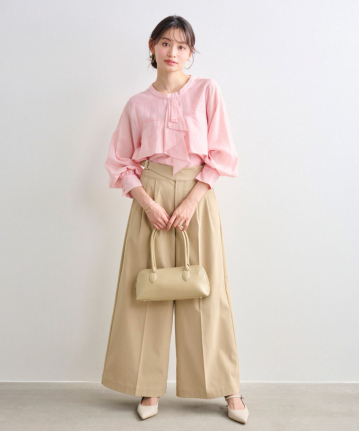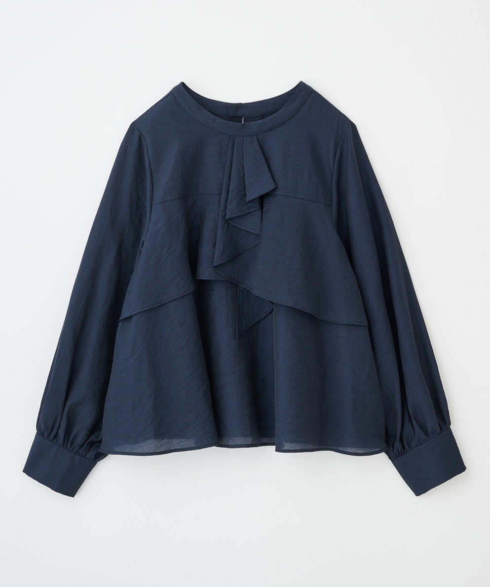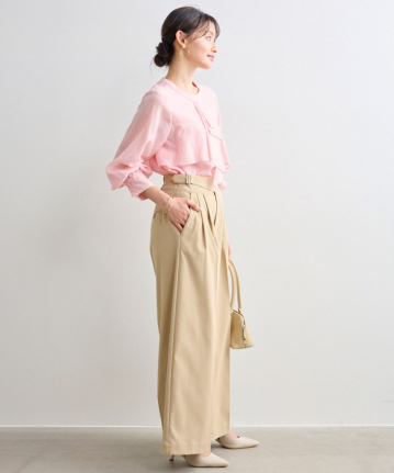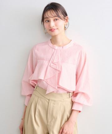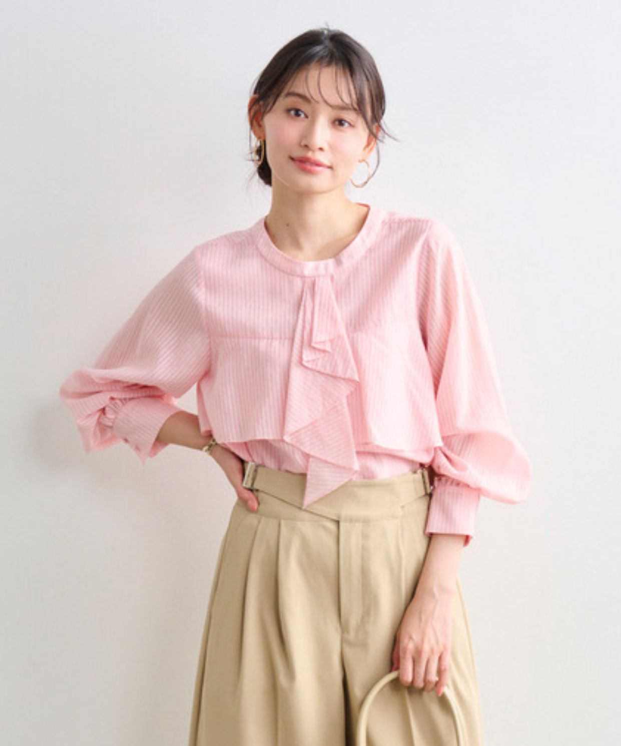 【着用感】:首周りが詰まりすぎておらず、かつボリュームを抑えたフリルで、華やかだがスッキリ見える