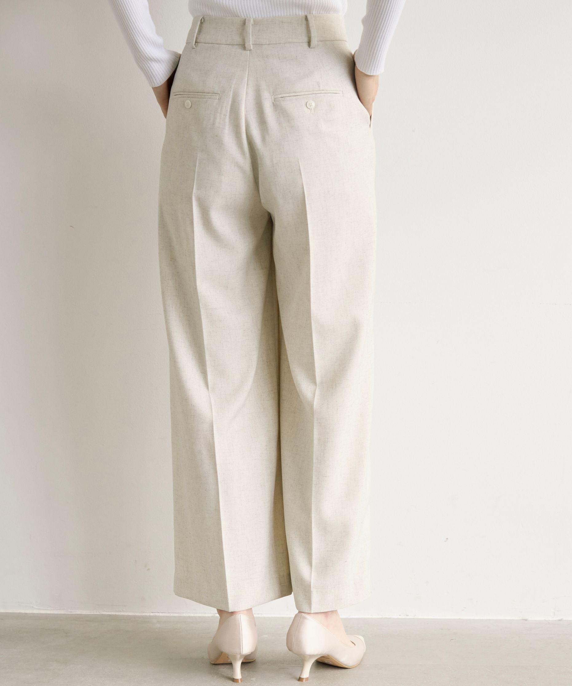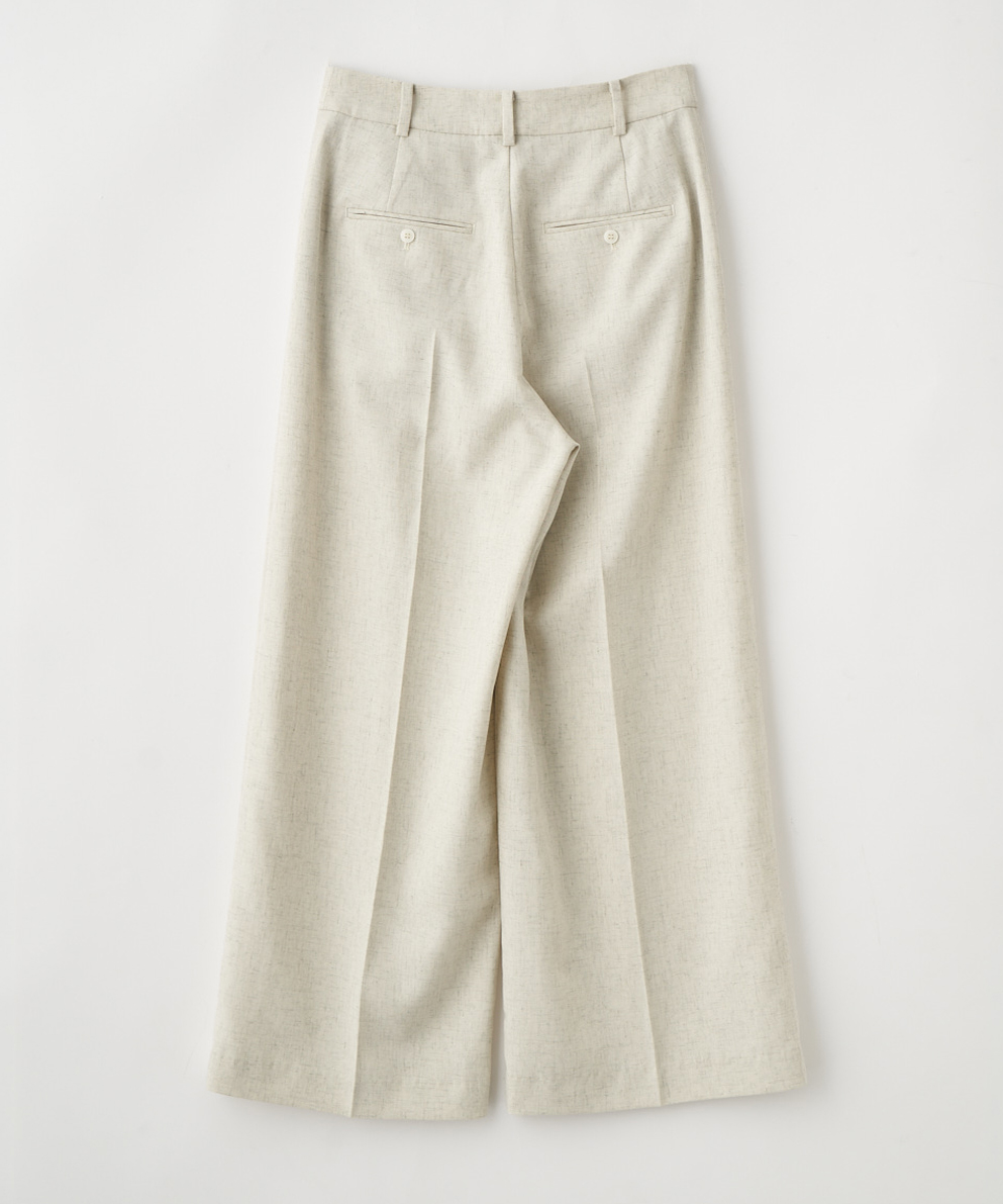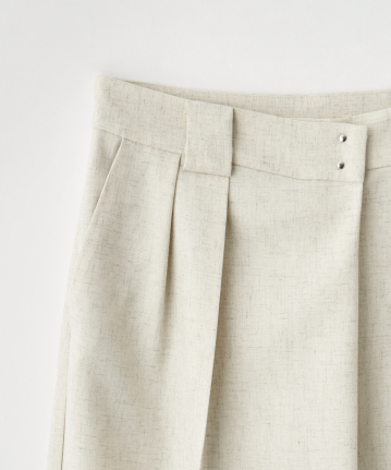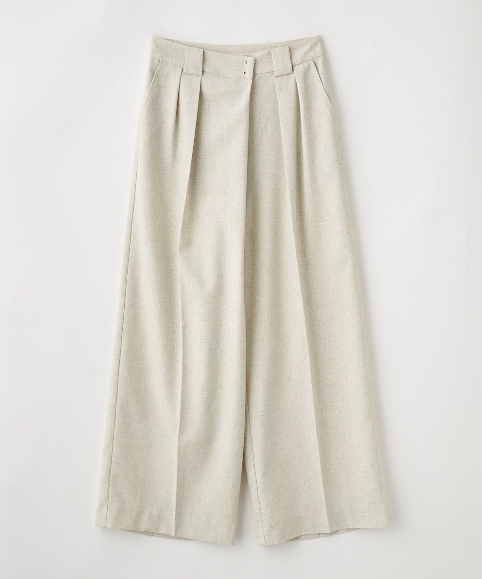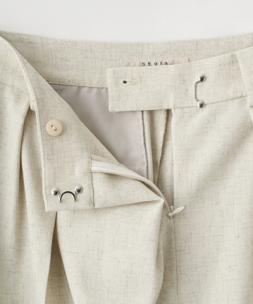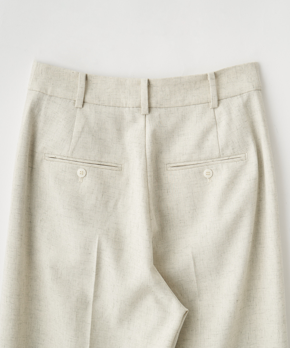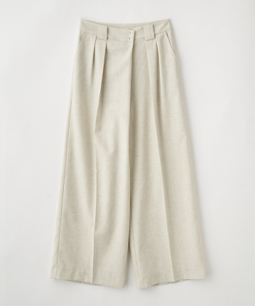 ・淡い杢調のきれいめ素材と、深く入ったタックが、カジュアルになりすぎず洗練された大人のムードを演出します。