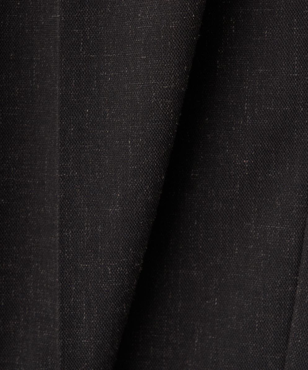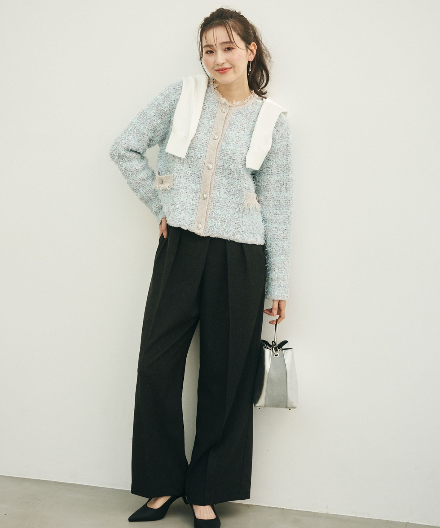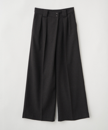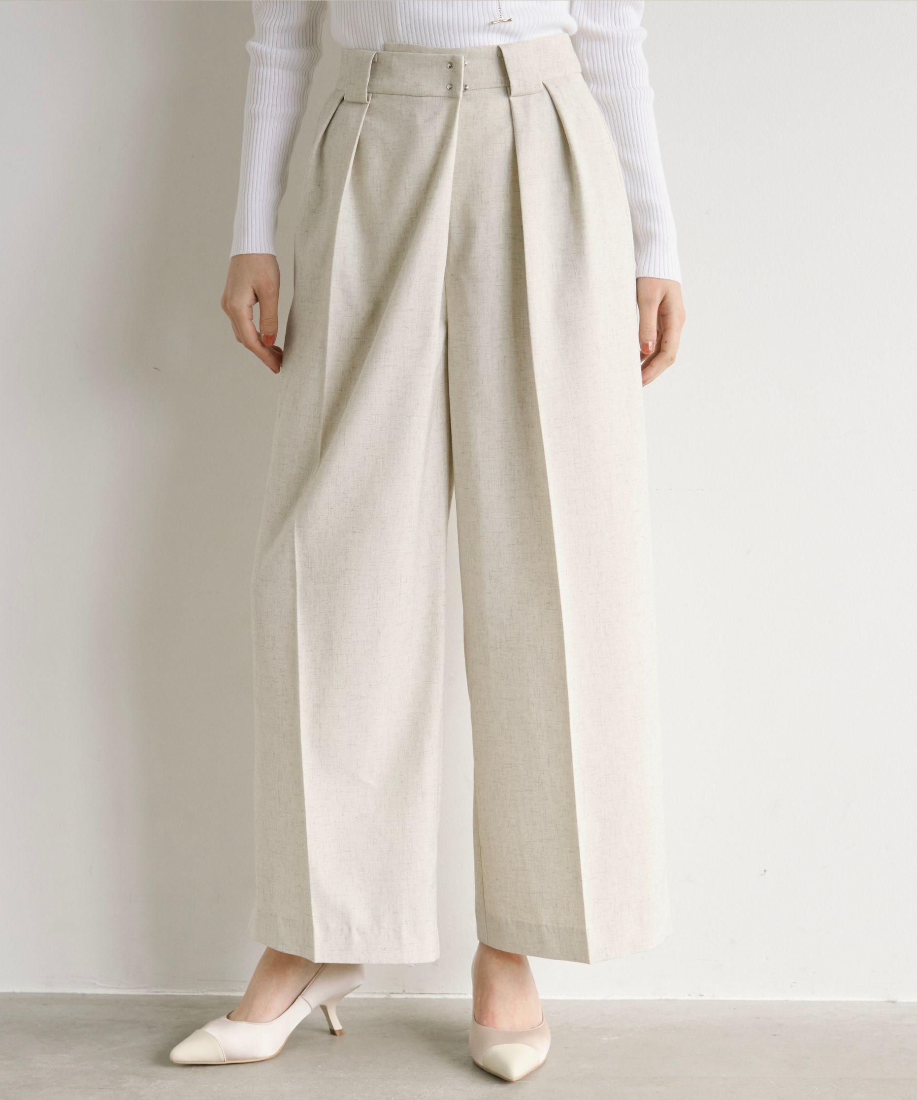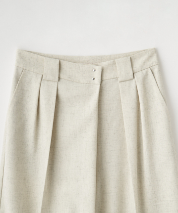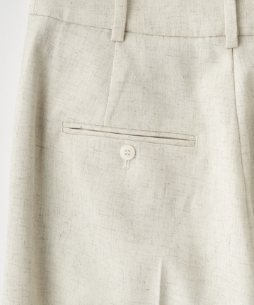 ・淡い杢調のきれいめ素材と、深く入ったタックが、カジュアルになりすぎず洗練された大人のムードを演出します。