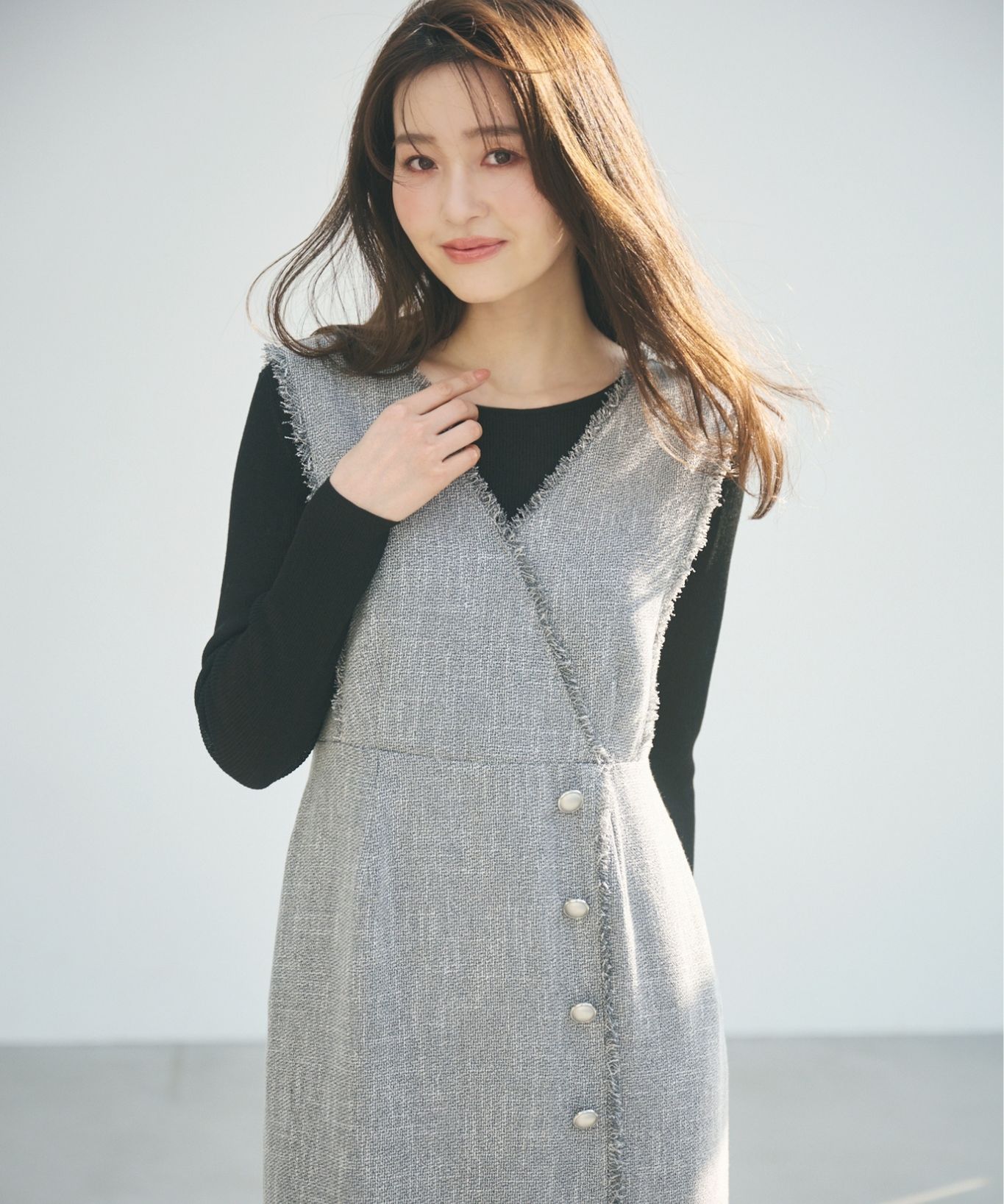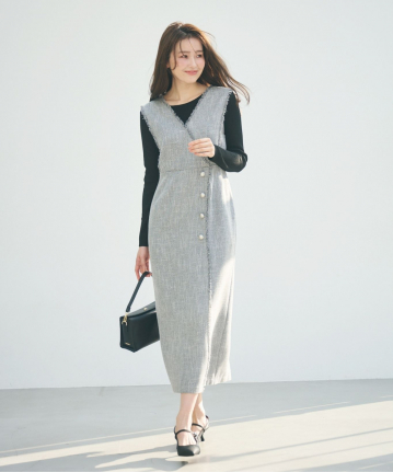 【素材感】:とても柔らかいツイード素材。フリンジの長さも短めで上品見えします。