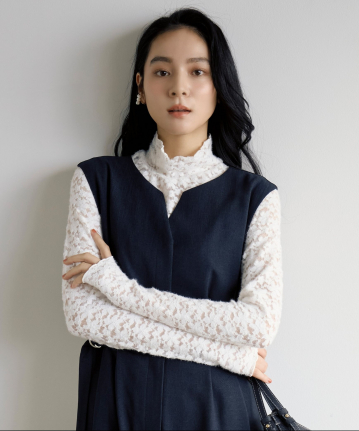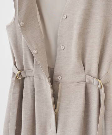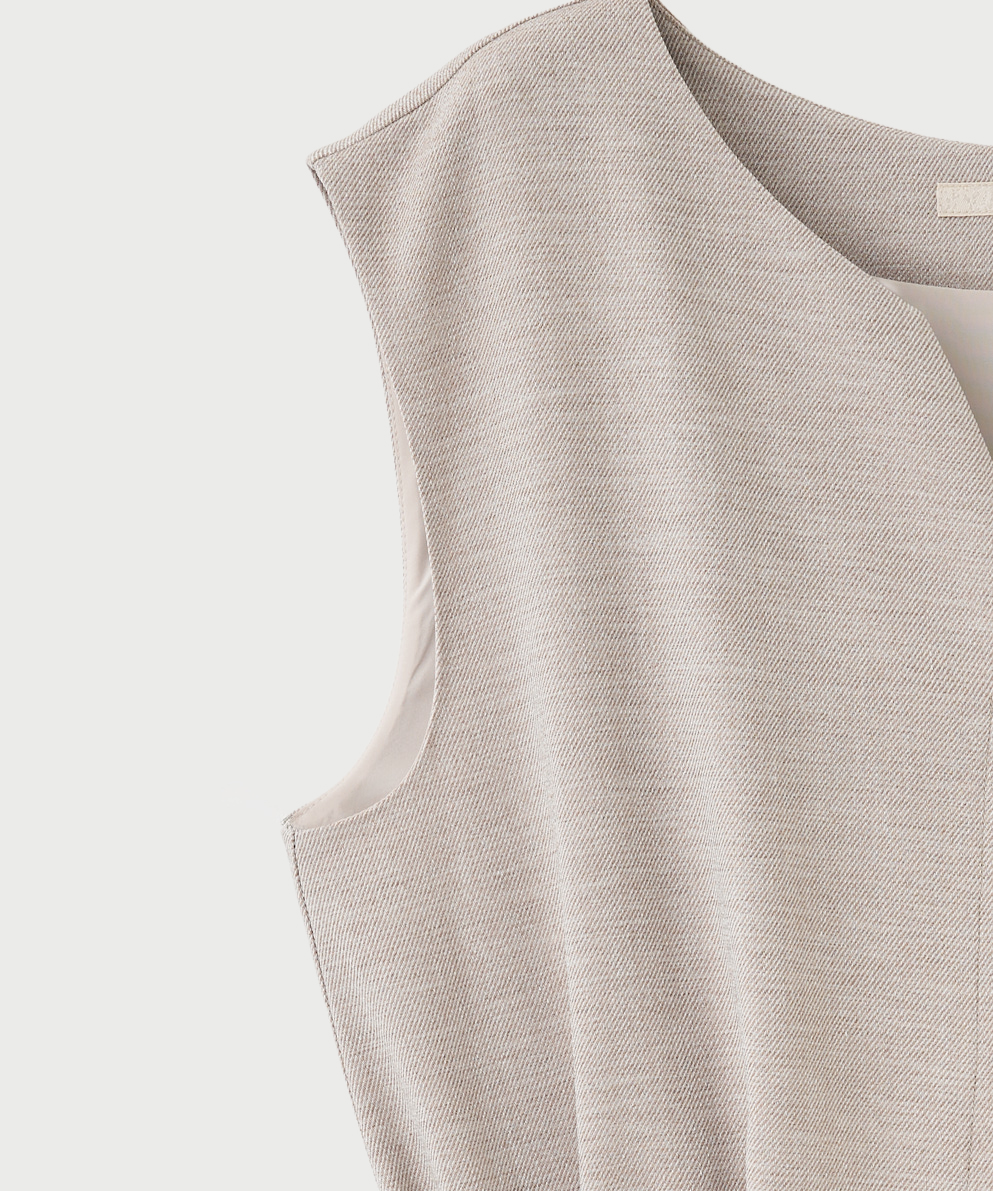 ・デコルテを美しく見せる、すっきりとしたVネックデザインで、ハイネックのニットやシンプルなカットソーなどを合わせて頂くのがオススメです。
