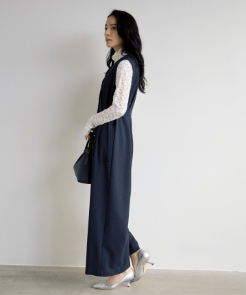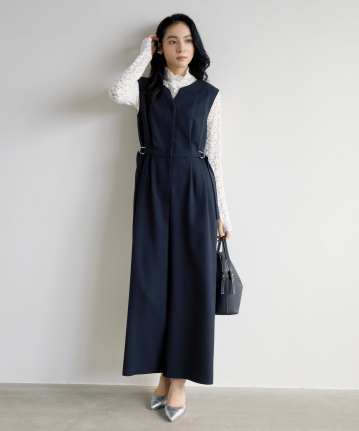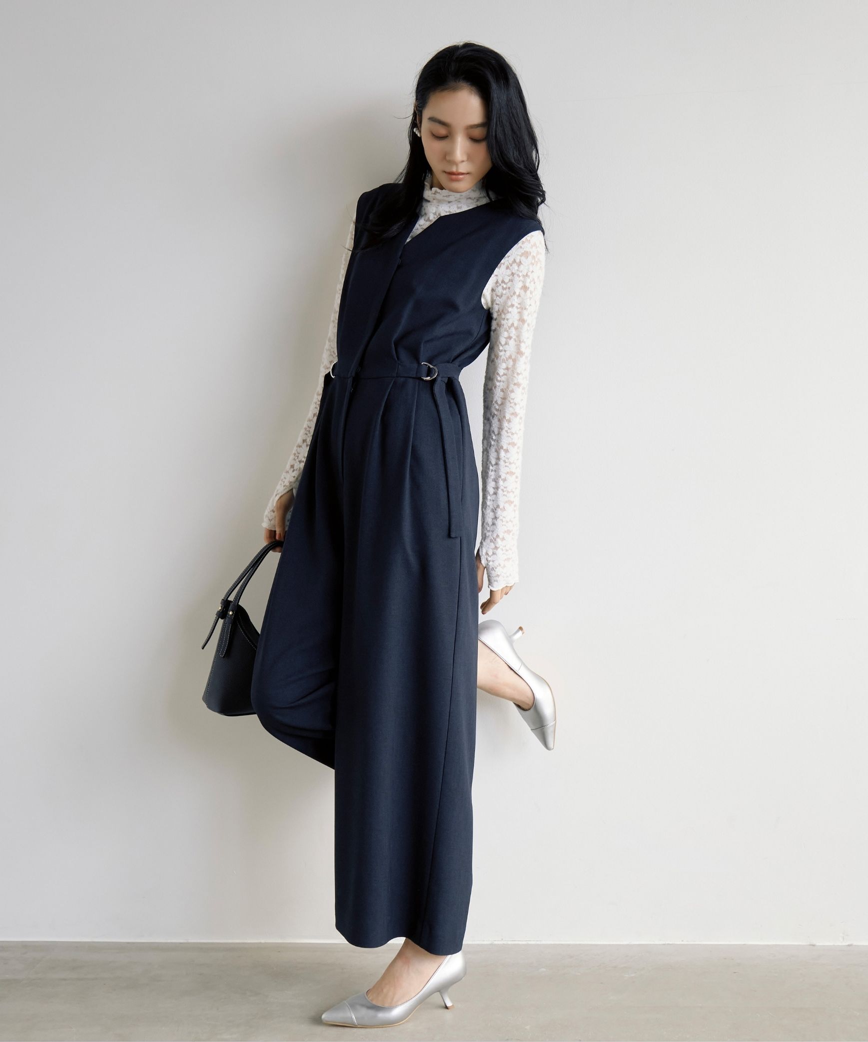 ・ウエスト位置を少し高めに設定し、Dカンベルトでキュッと絞ることでメリハリが生まれ、脚長効果とスタイルアップを実現します。