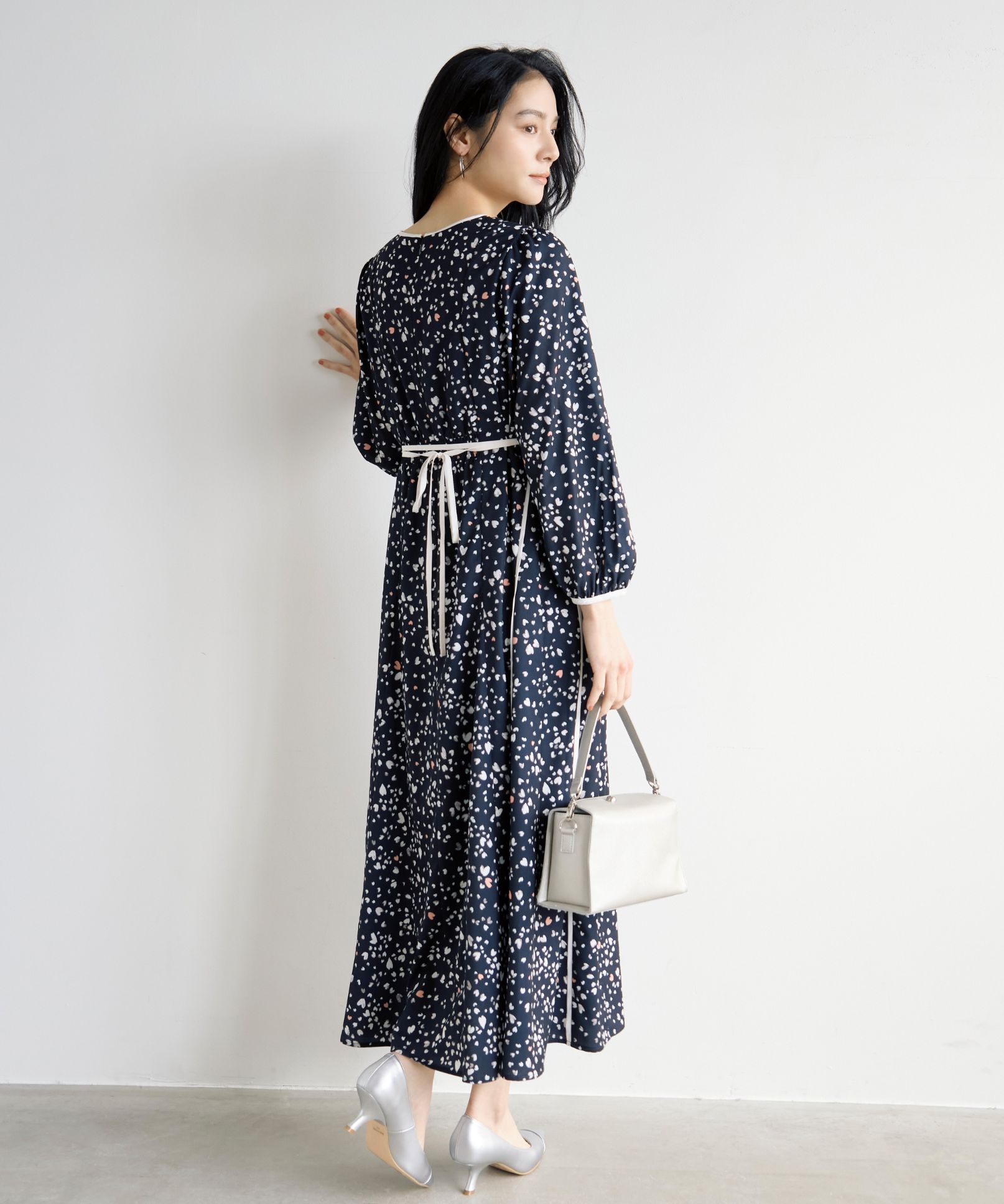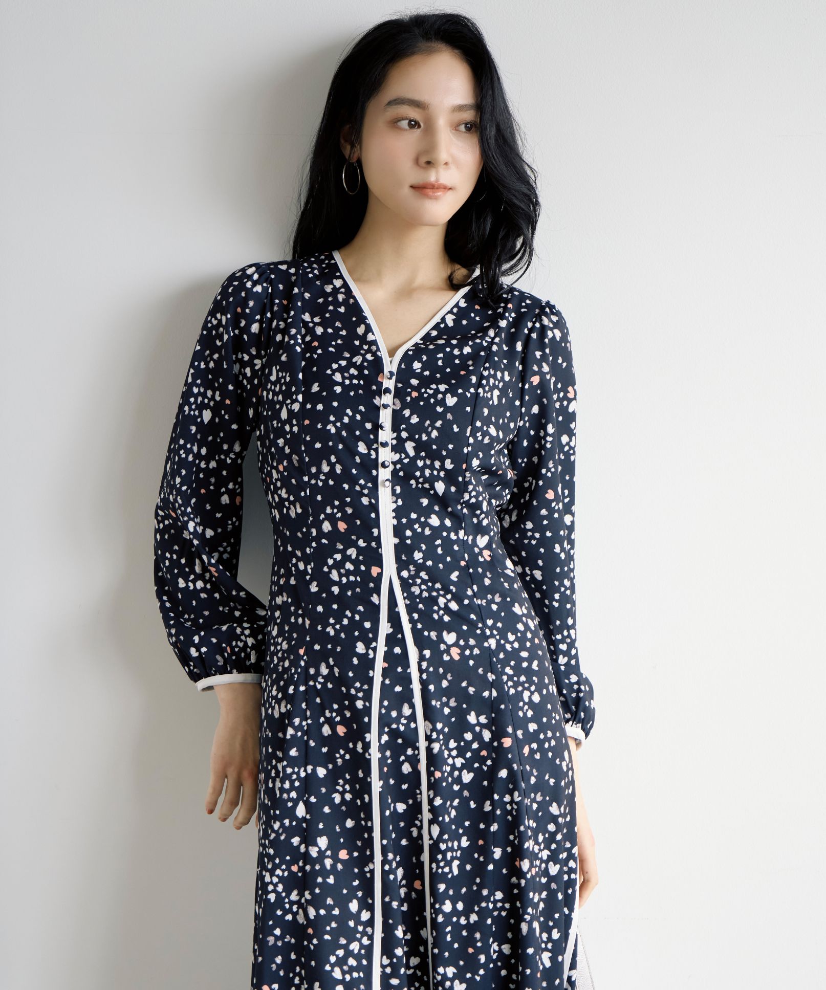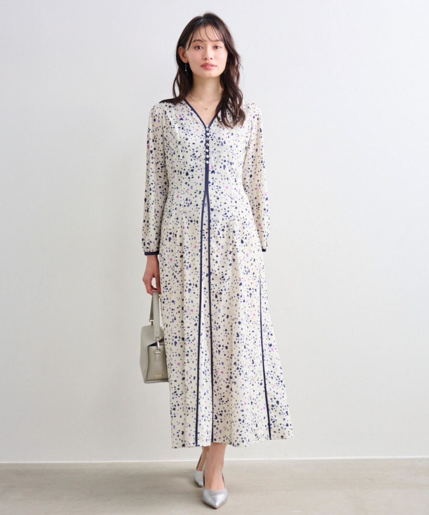 ・顔周りをすっきりと見せるVネックラインと、フロントからウエスト、スカート部分にあしらわれた配色パイピングがアクセントになっています。