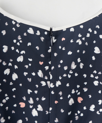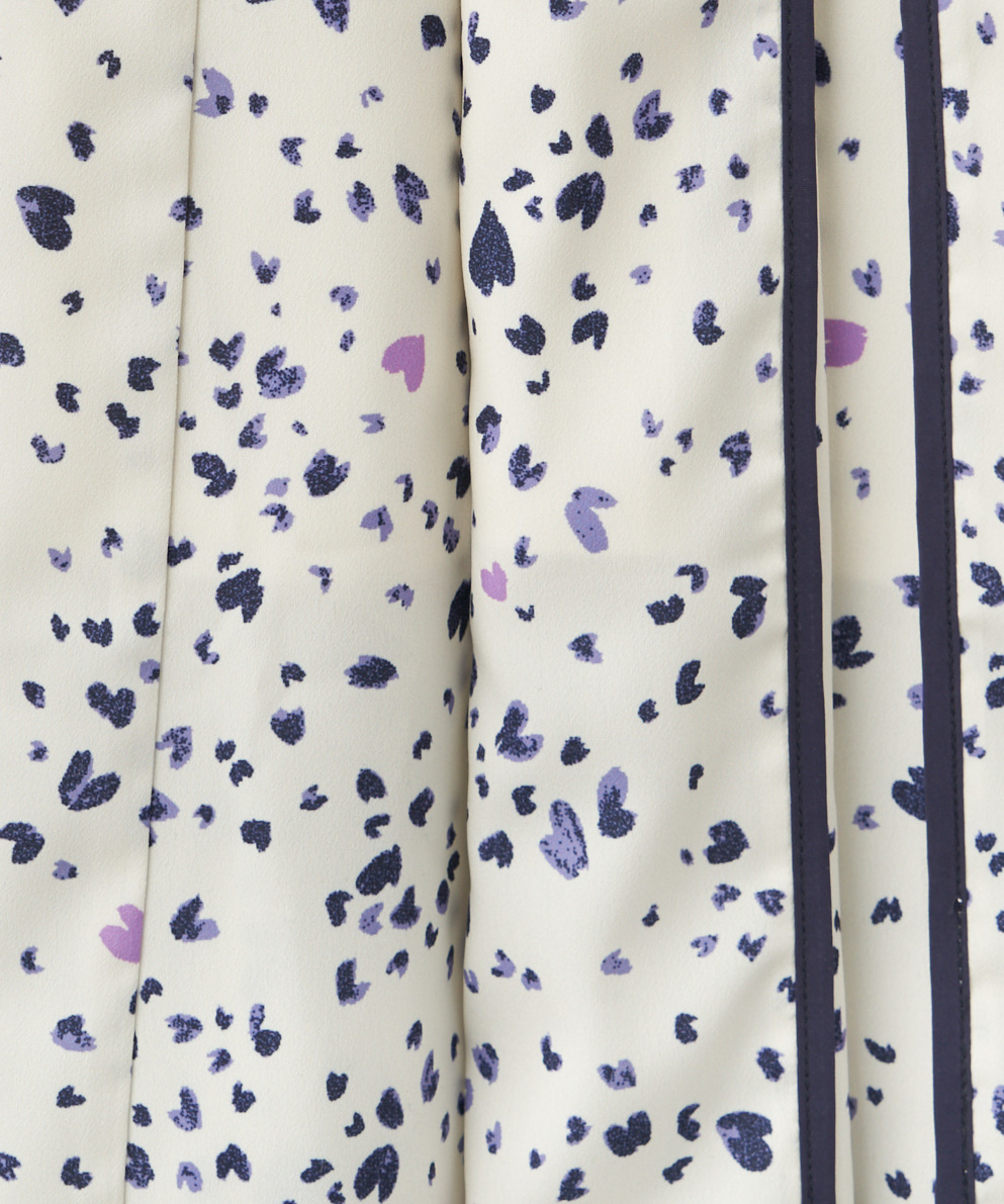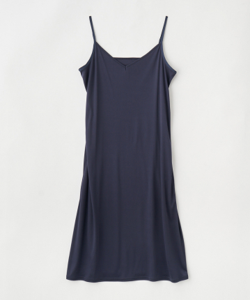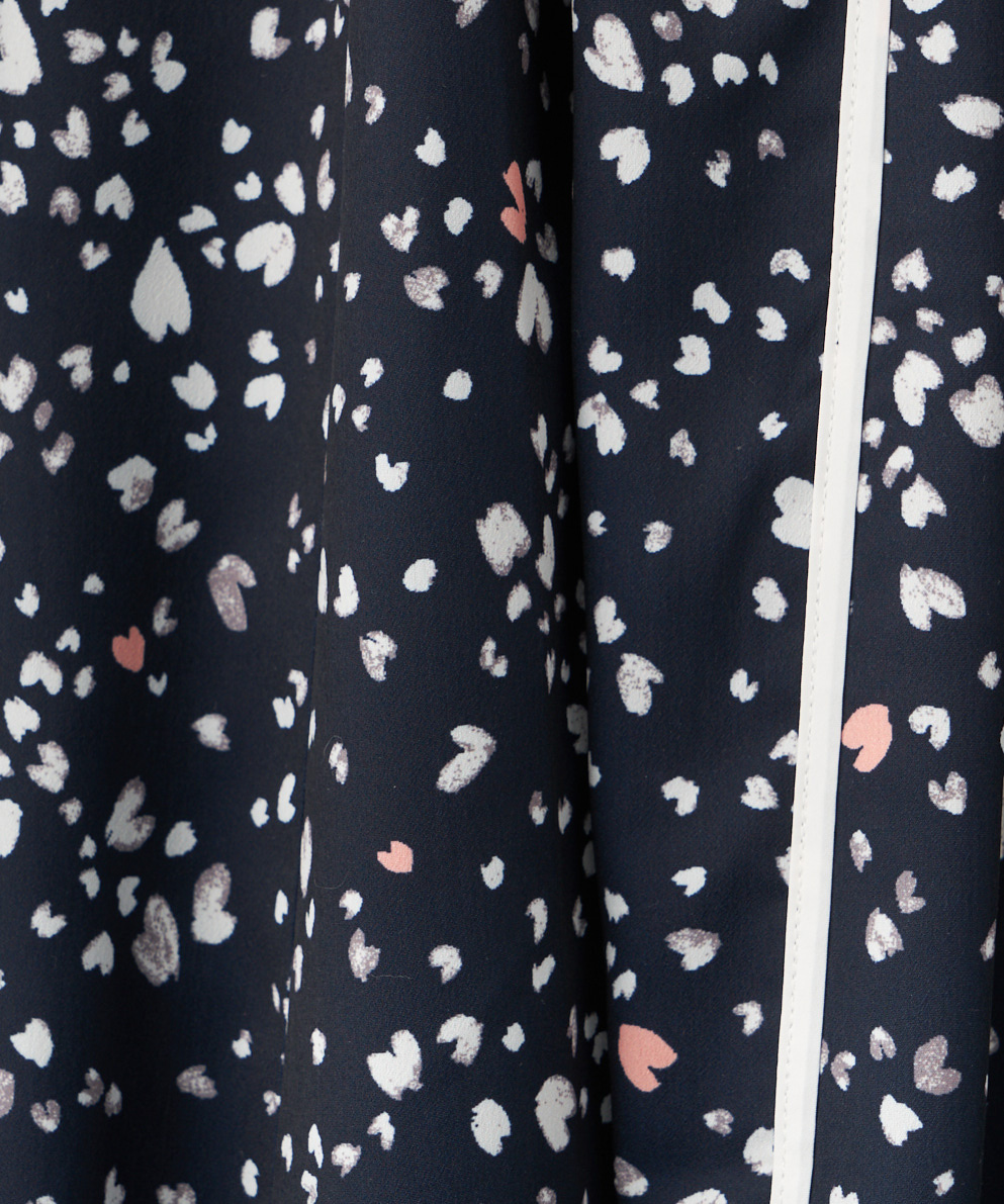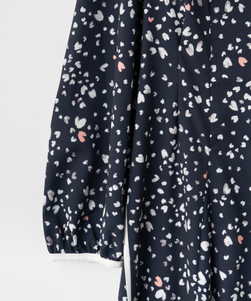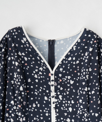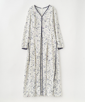 ・顔周りをすっきりと見せるVネックラインと、フロントからウエスト、スカート部分にあしらわれた配色パイピングがアクセントになっています。