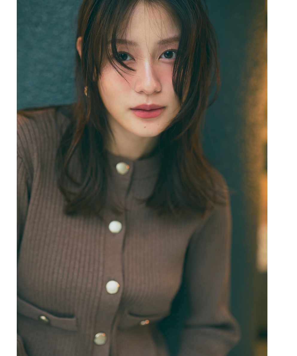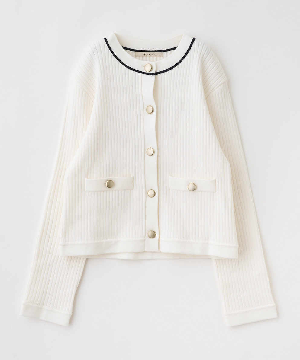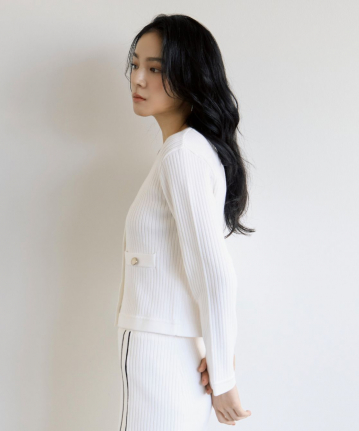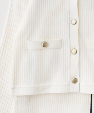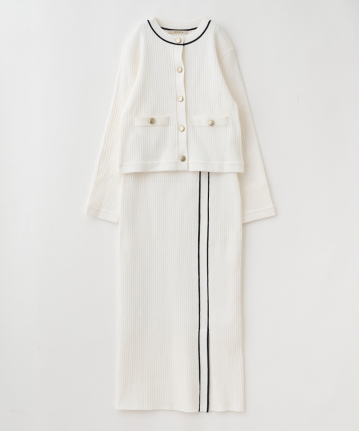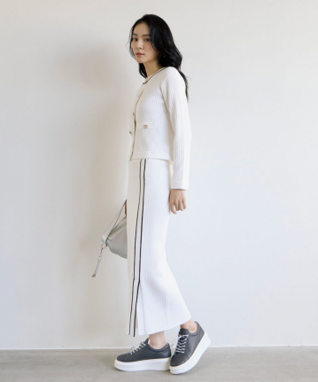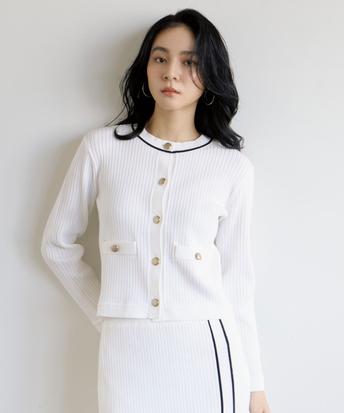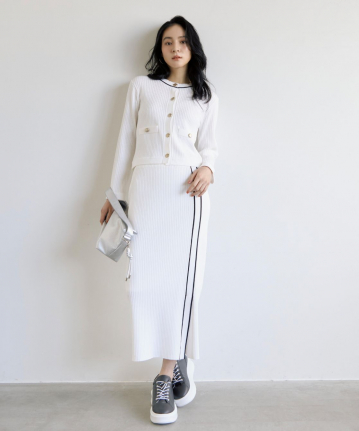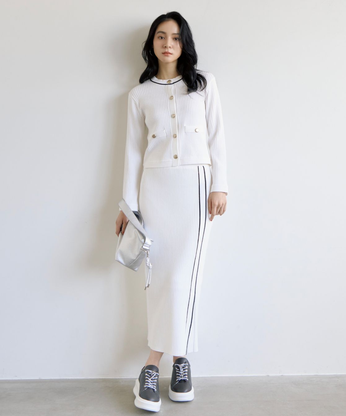 ・カーディガンは金ボタンとポケットディティールでジャケットのようなきちんと感を、スカートはIラインとスリットで美脚効果抜群です。