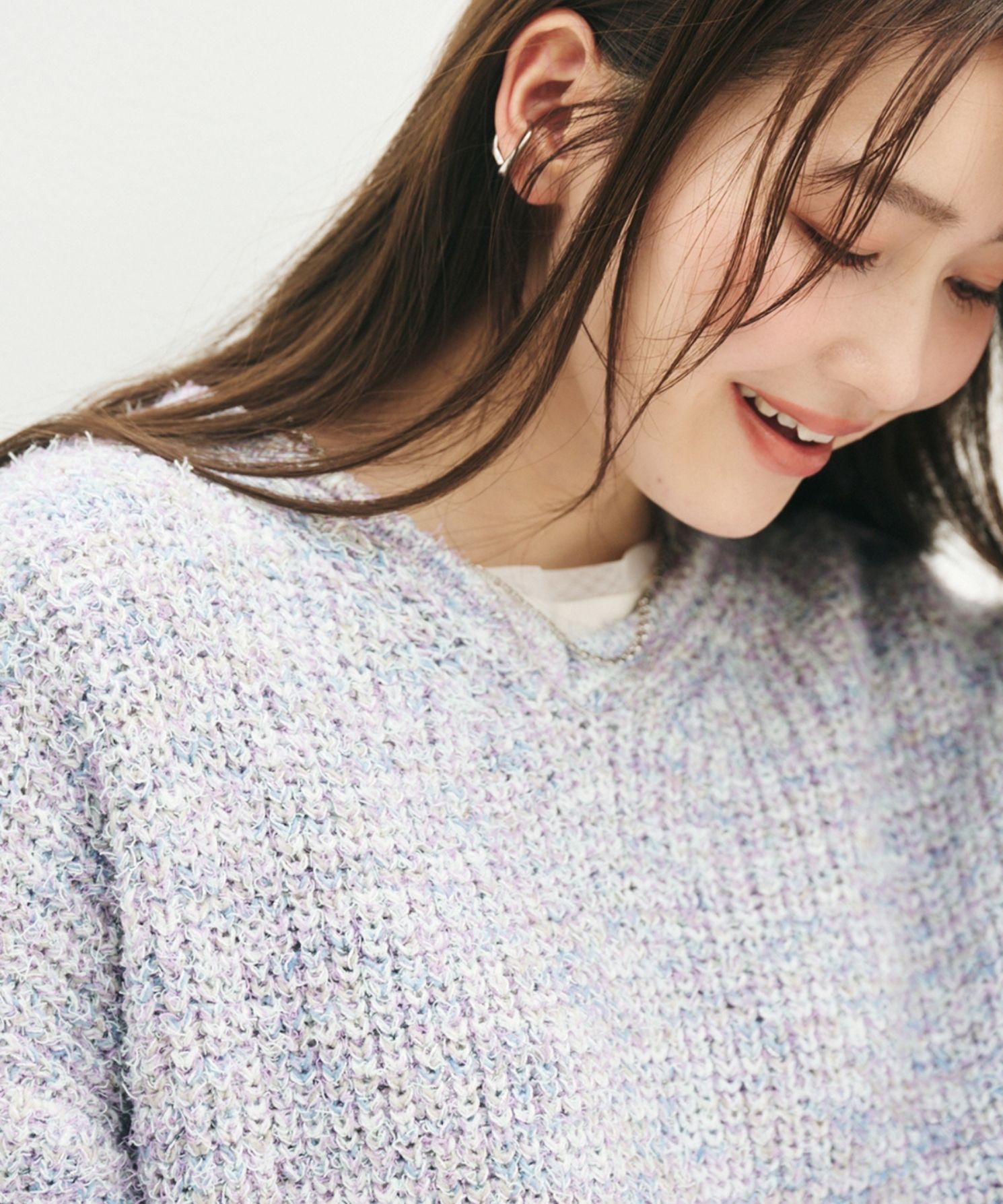 ・様々なカラーの糸がミックスされた、表情豊かなファンシーヤーンのニットプルオーバーです。