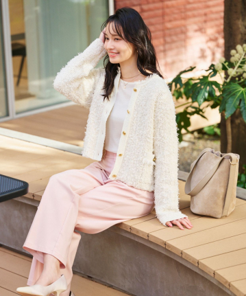 【素材感】:オフ×ライトブルー×ブルーと濃淡があり、唯一無二の色。キラキラとした光沢の糸が混ざっているが、チクチク感はない。