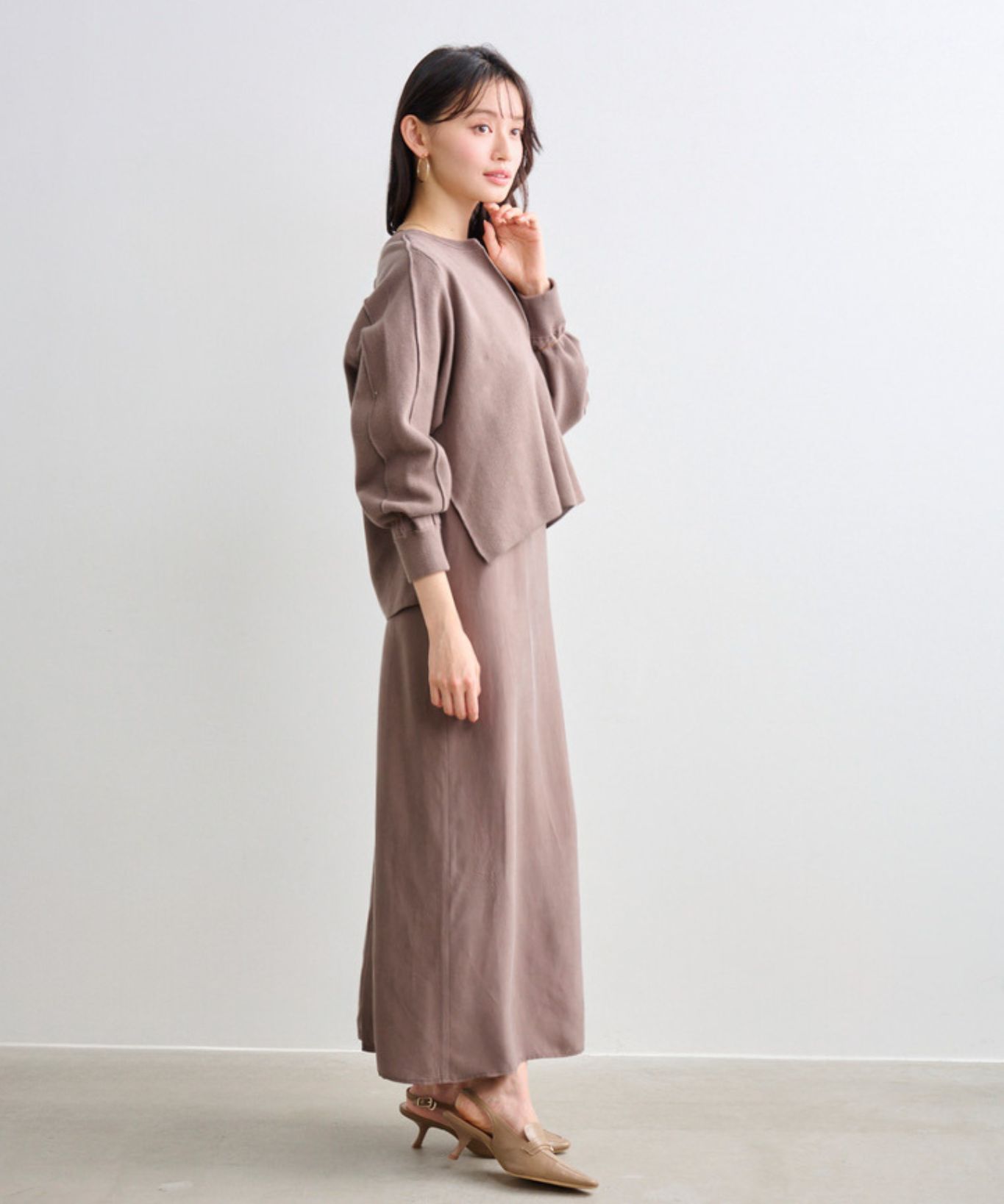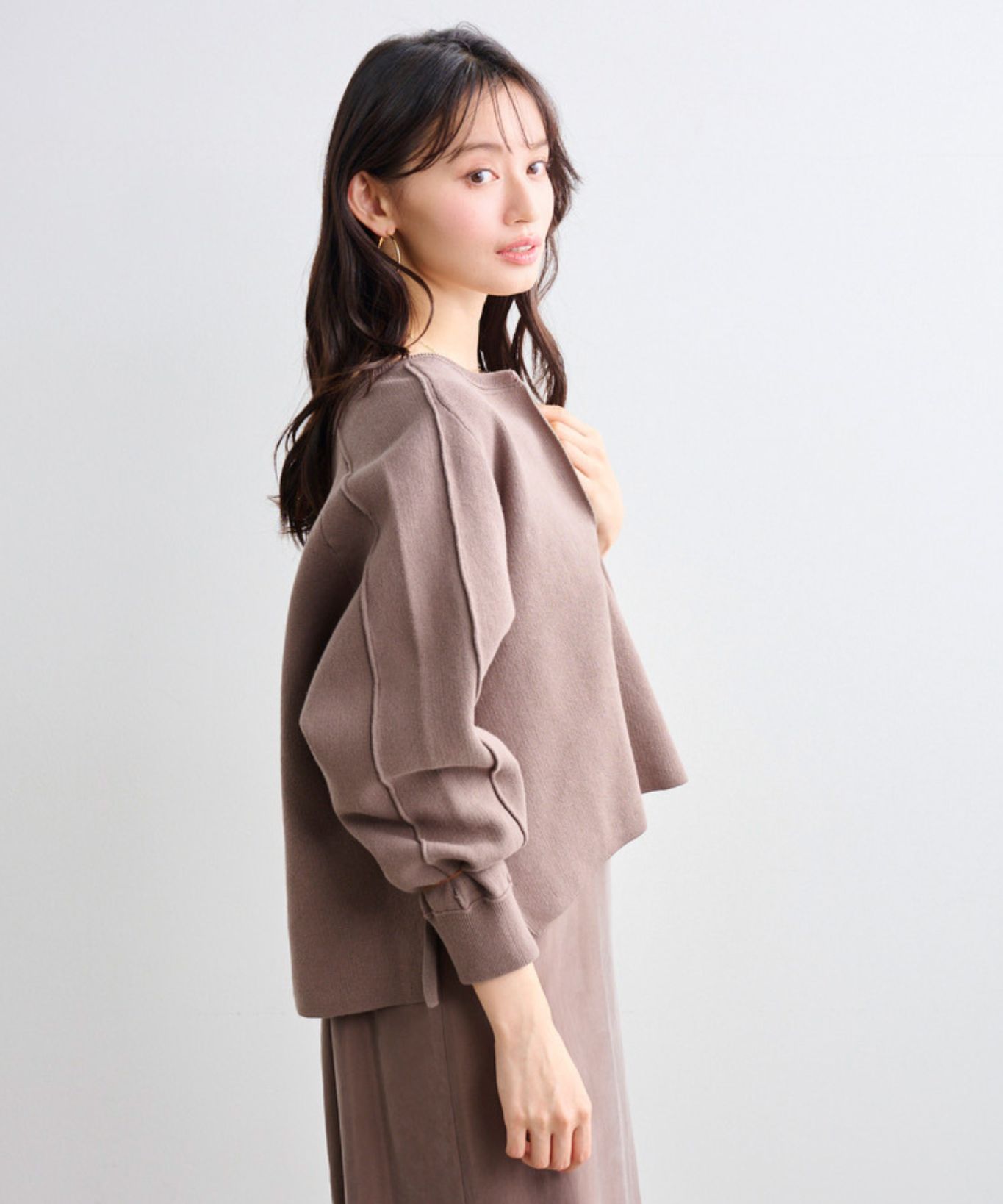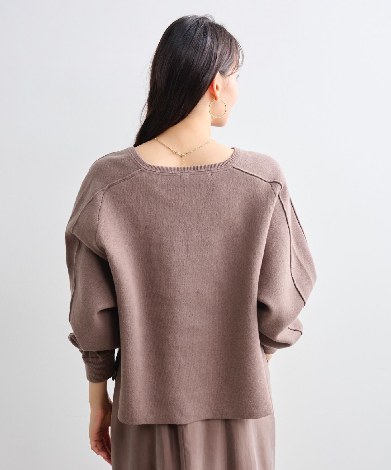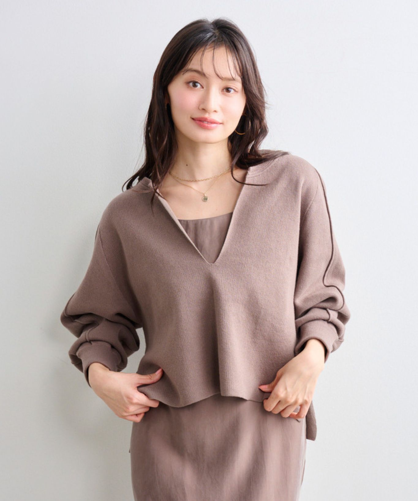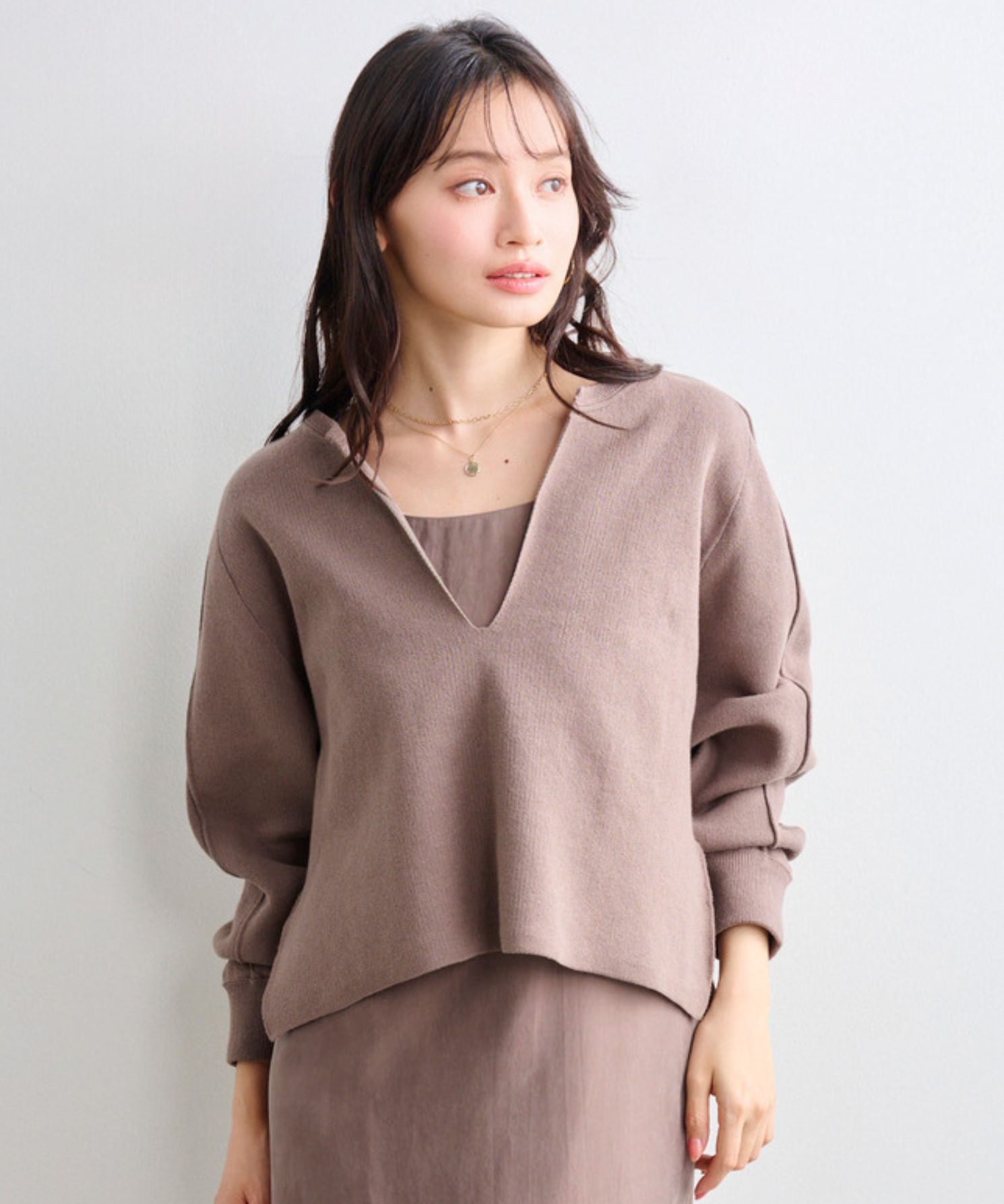 ・ゆったりめの身幅で身体のラインを拾わず、安心してご着用頂け、深めのスリットネックはデコルテラインを綺麗に見せてくれます。