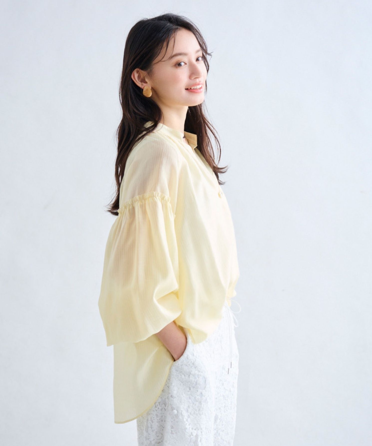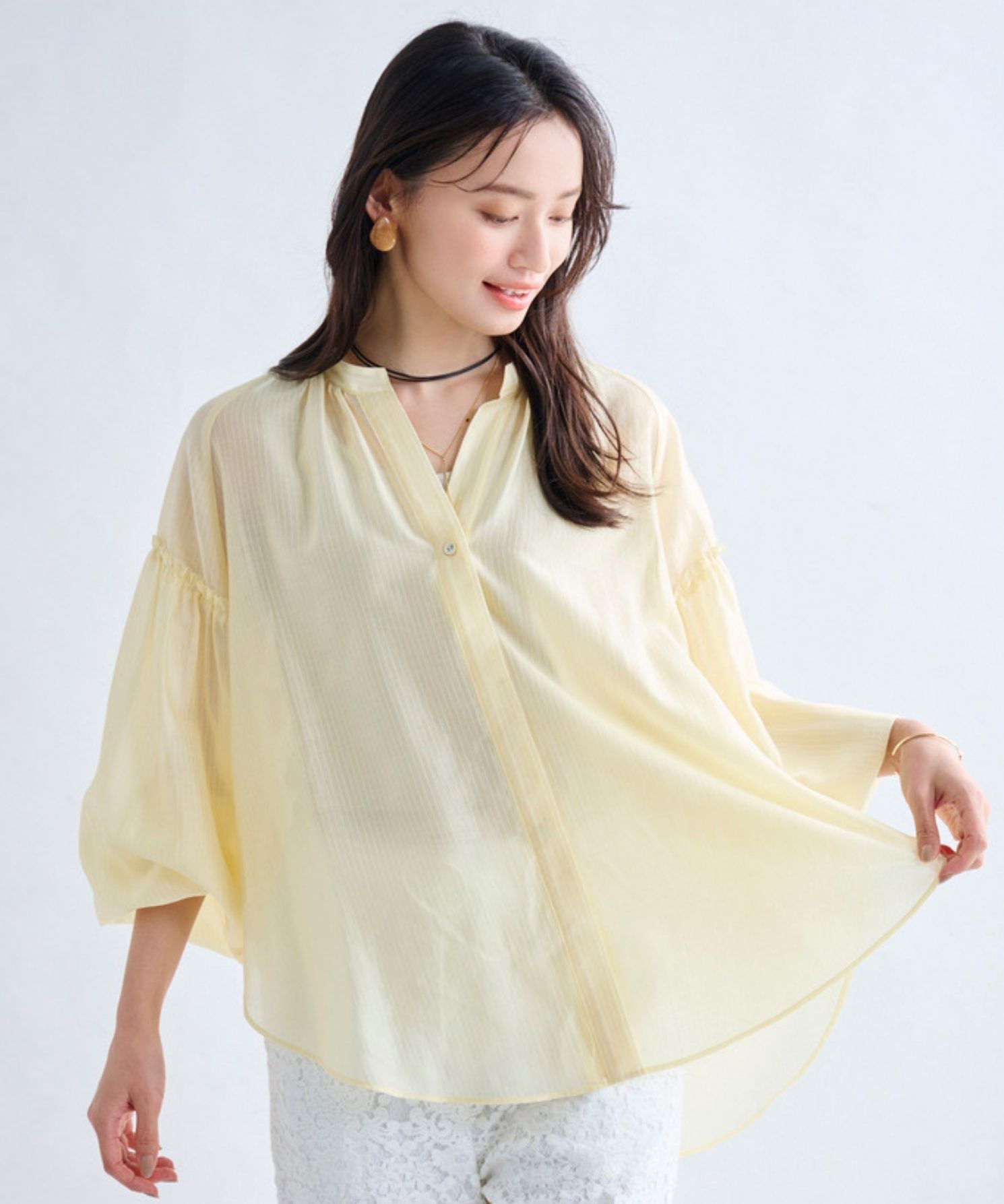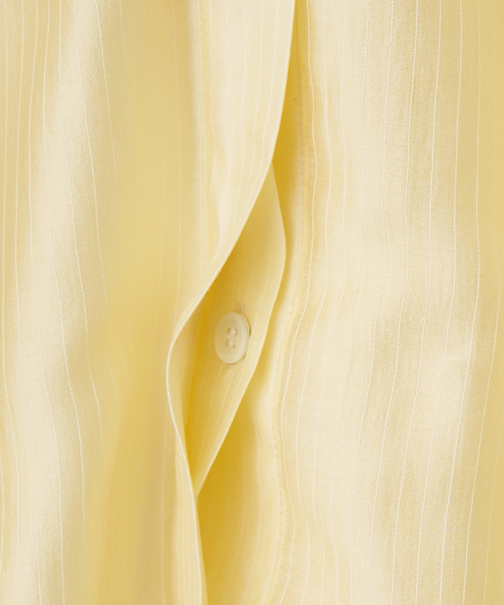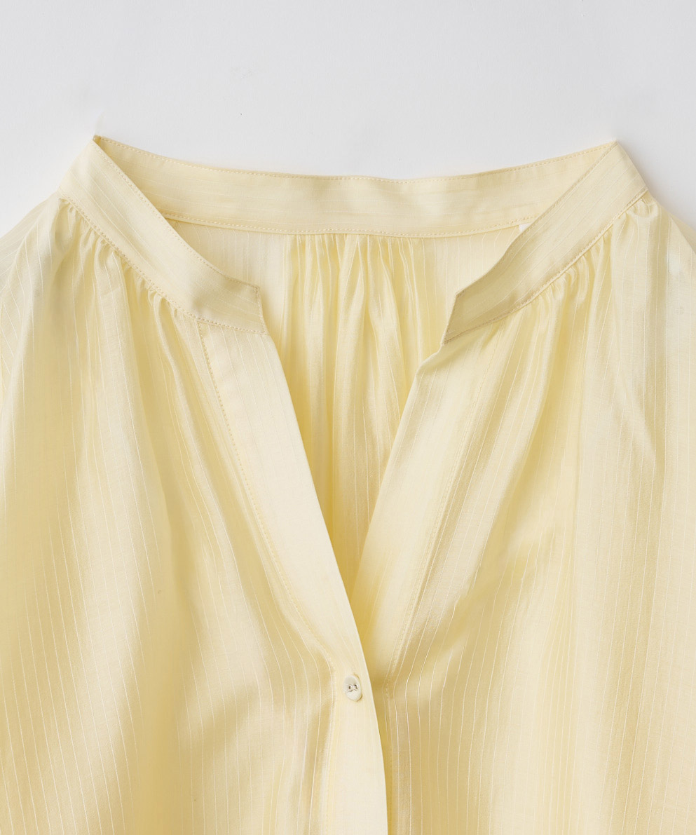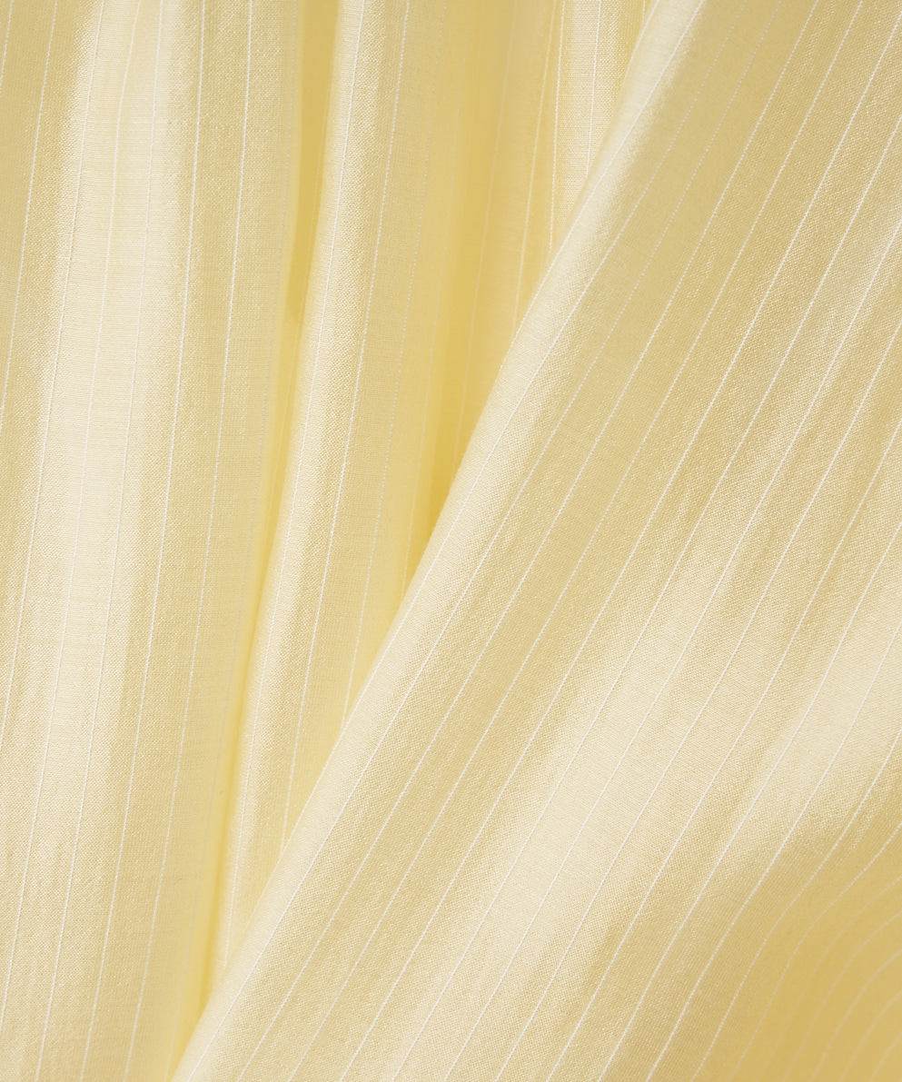 ・セルロースのしなやかな落ち感と上品な光沢がポイントです。軽やかで肌離れがよく、ストライプ柄がすっきりとした印象を演出します。