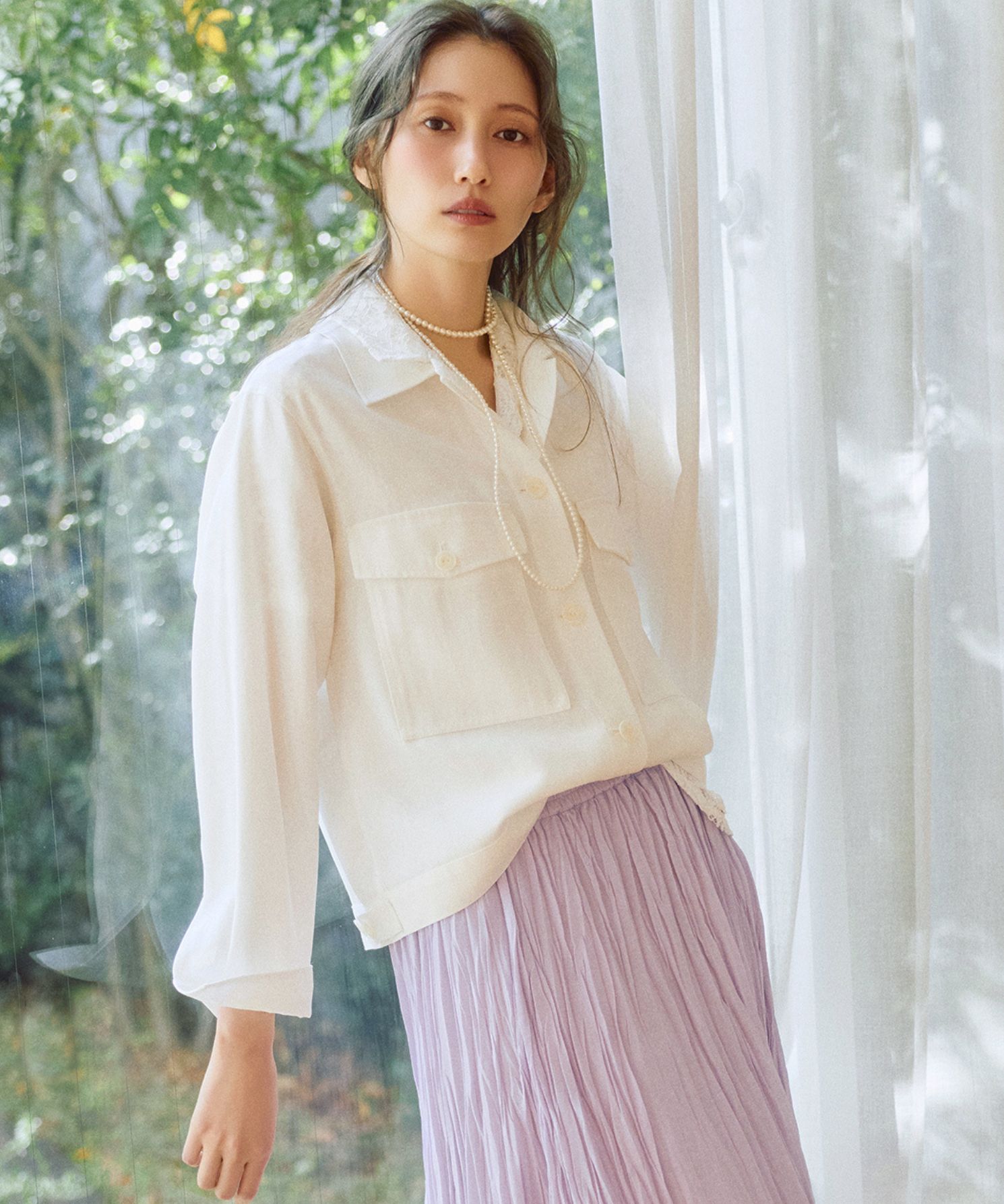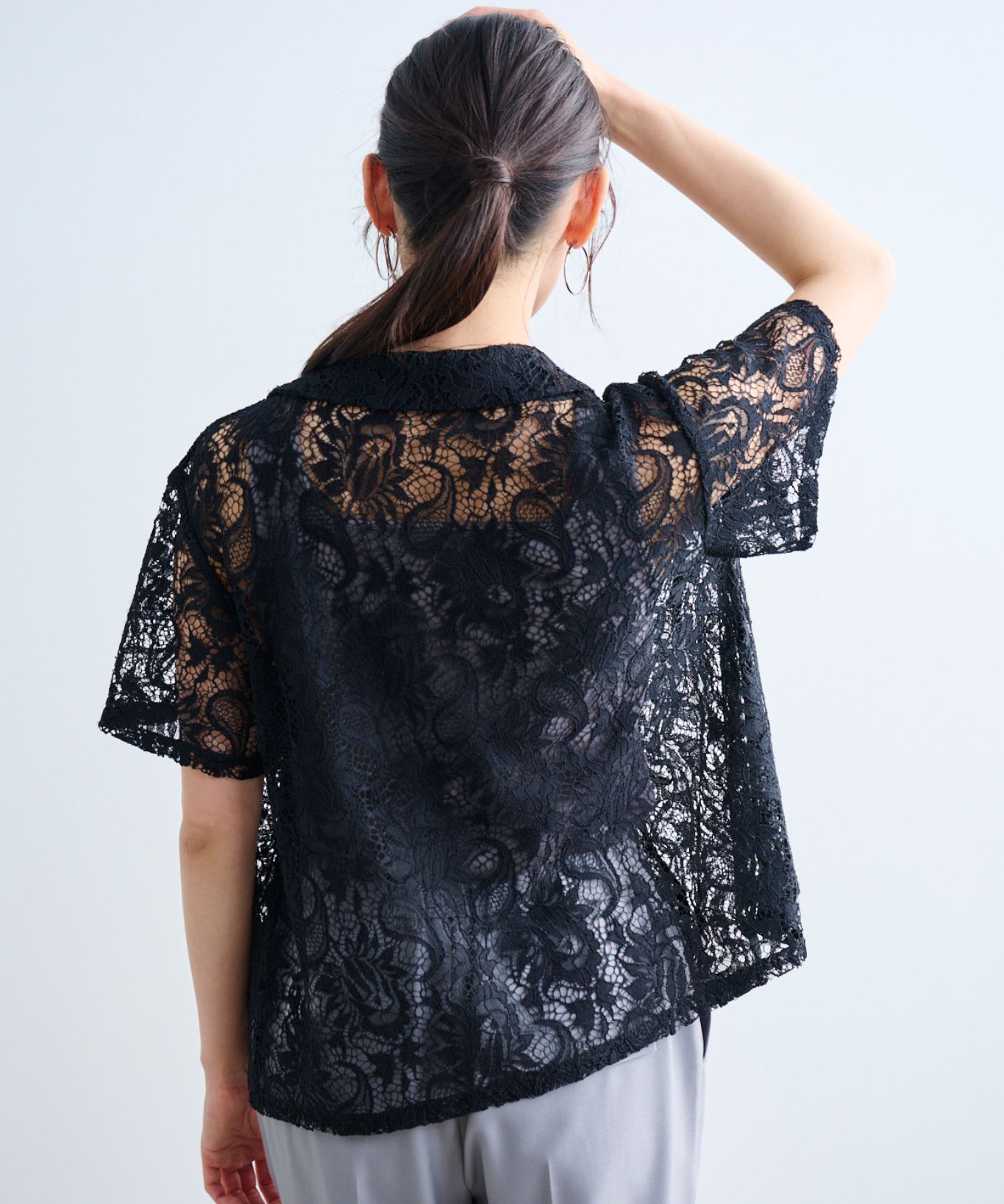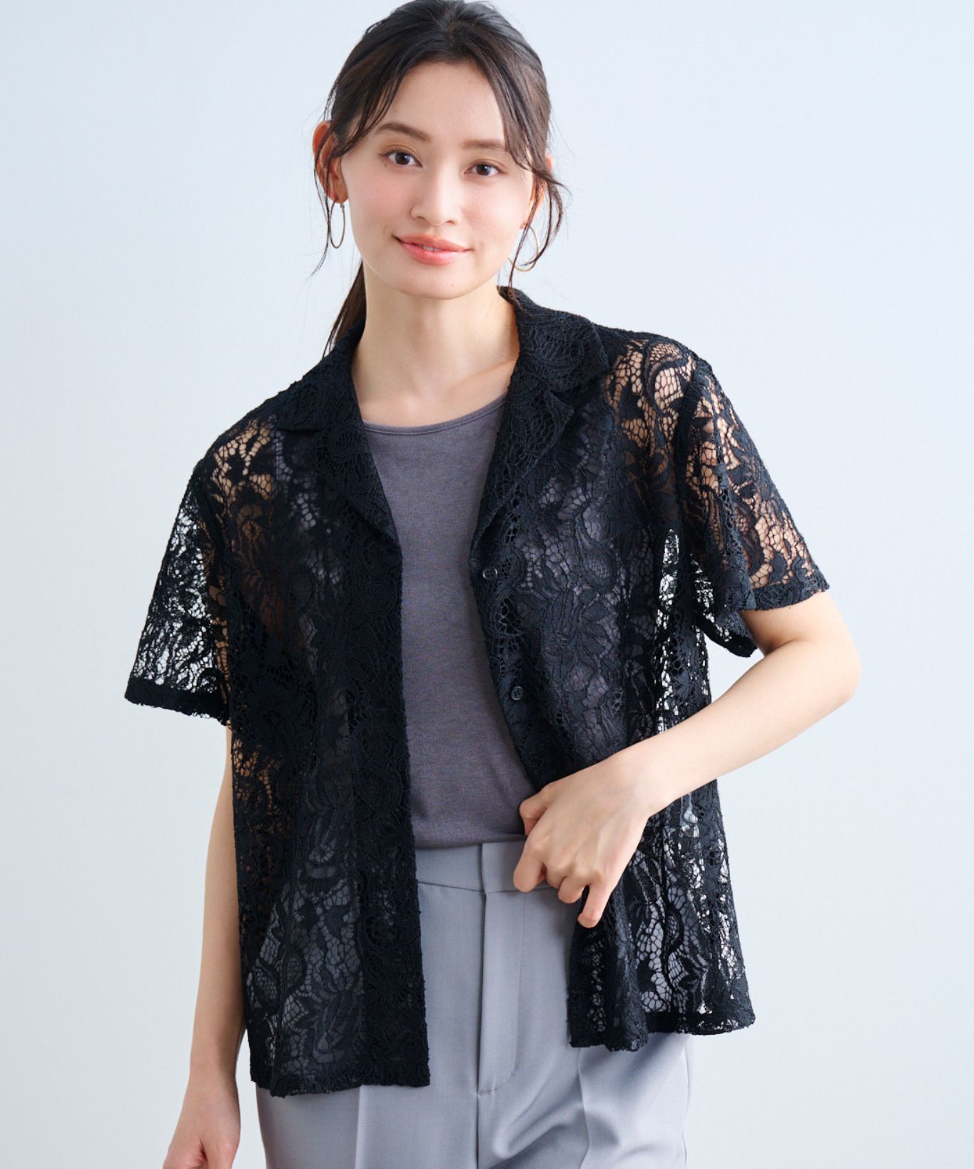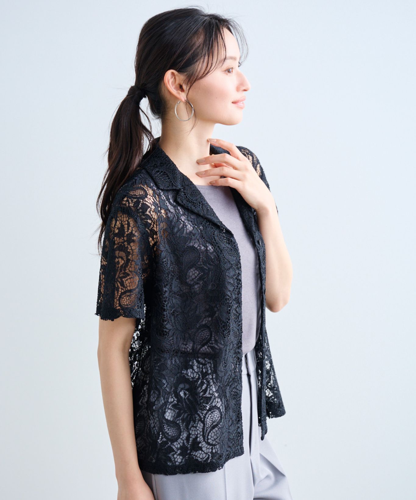 ・レース特有の繊細な素材感と透け感で、シャツスタイルでもフェミニンな印象に。ラフにさっと羽織るだけでも程良く女性らしく着こなすことができます。
