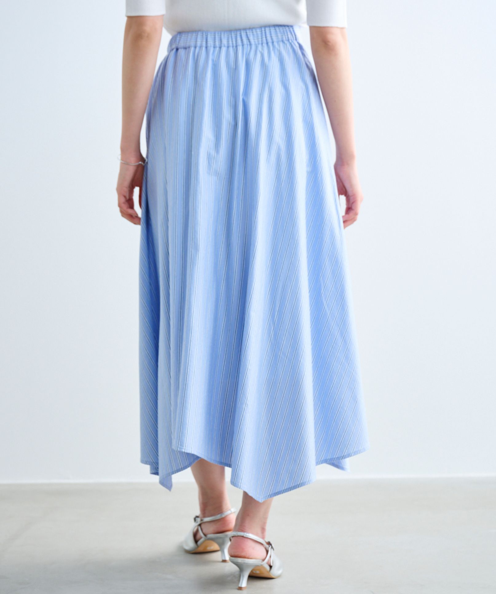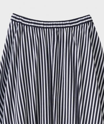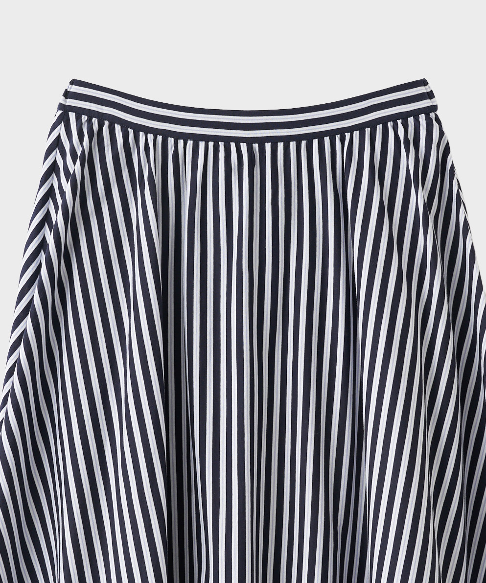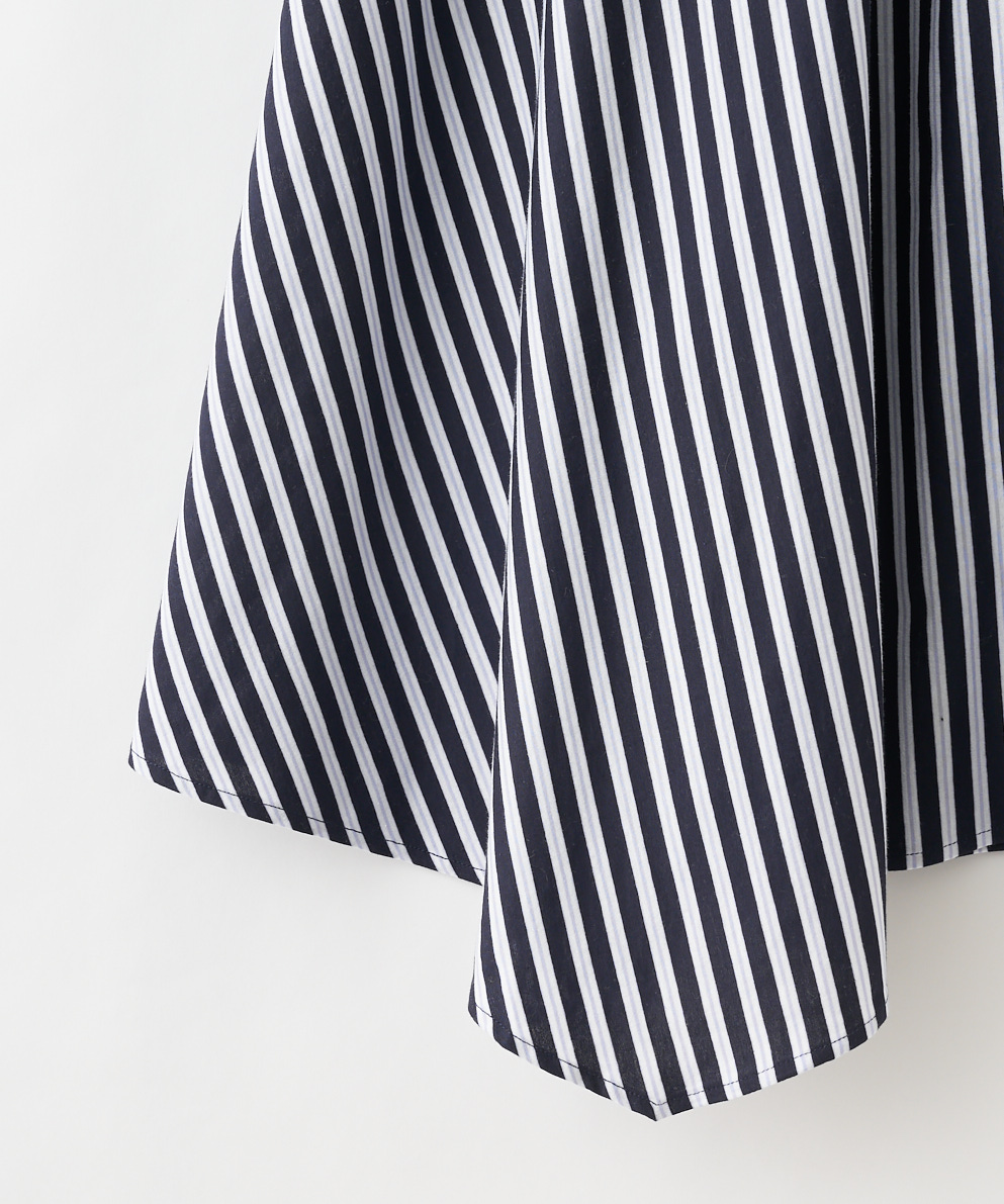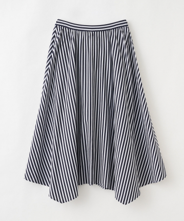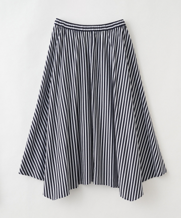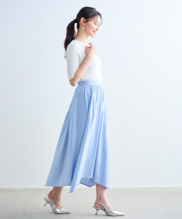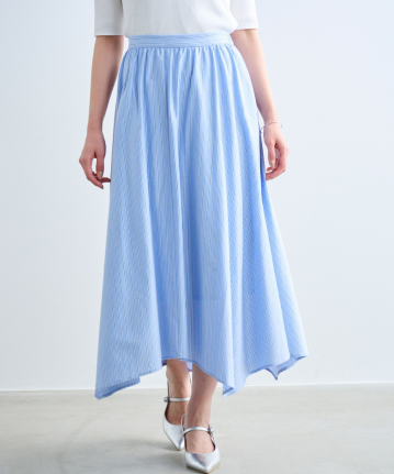 ・動きのあるイレギュラーヘムがポイントのフレアスカートです。カジュアルダウンしがちなストライプ柄も、品良く着用して頂ける、夏らしい大人のスカートに仕上げました。