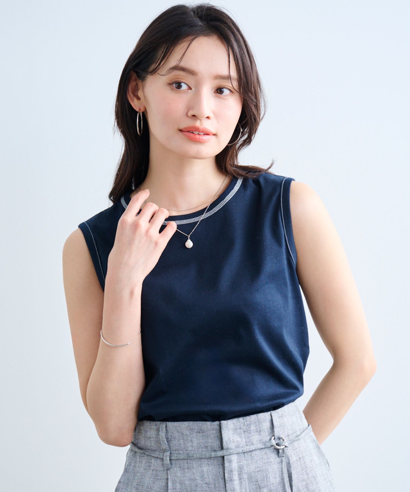 ・衿ぐりと袖ぐりにあしらった微配色ステッチが、さりげないアクセントをプラス。