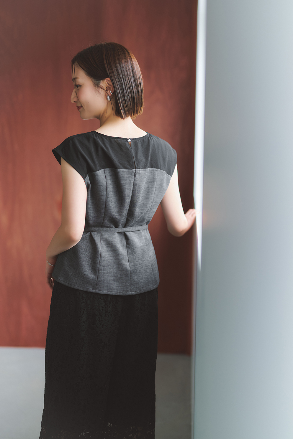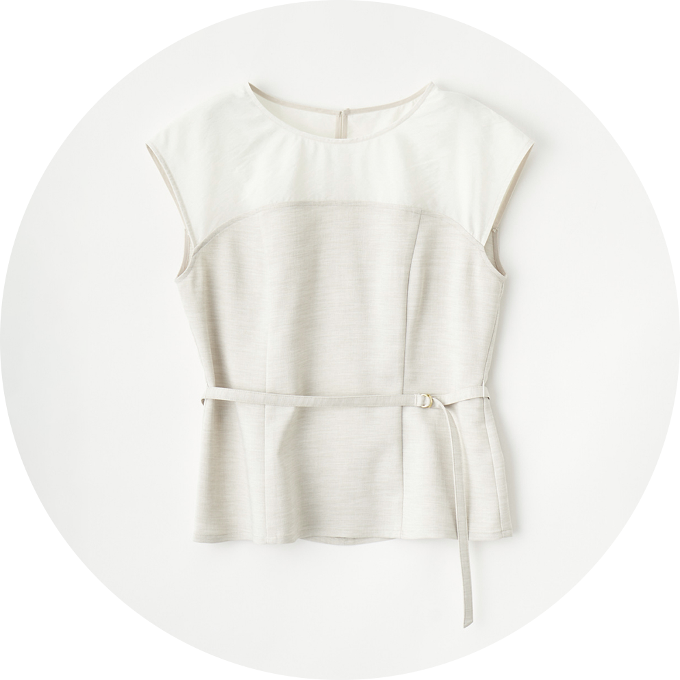 ウエストをシェイプさせたブラウスなら、フレア