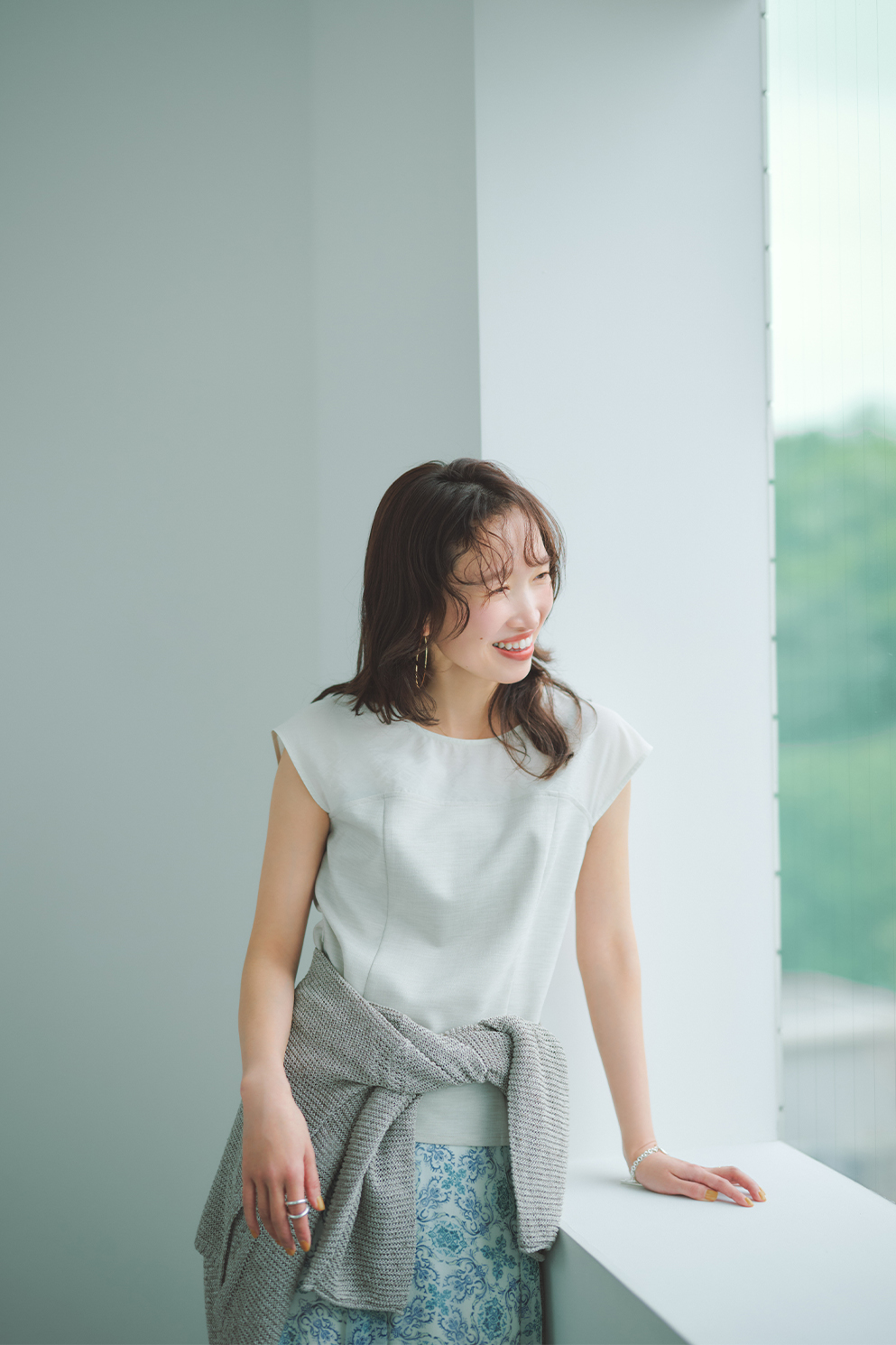 スタイルには、ラフにニットを肩掛けして抜け感と