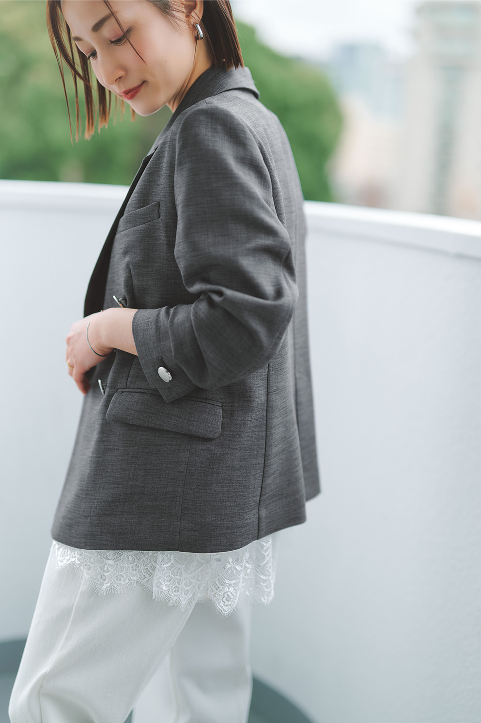 ハンサムなグレージャケットに、トレンドのレースを